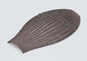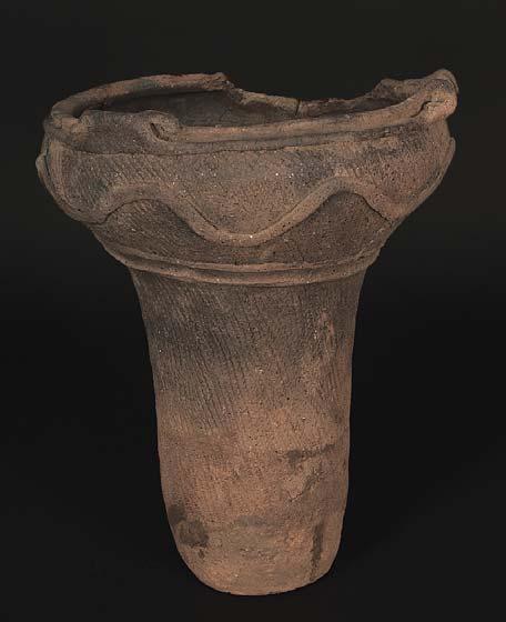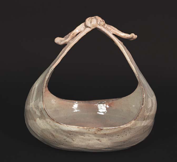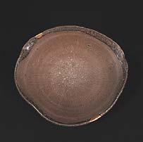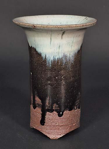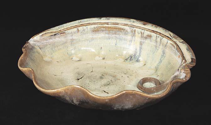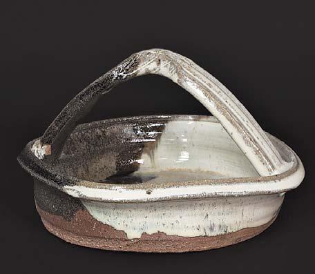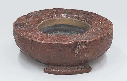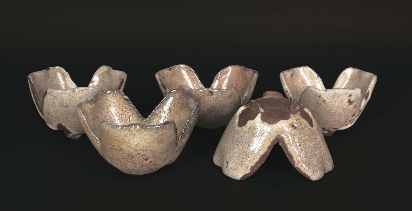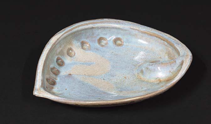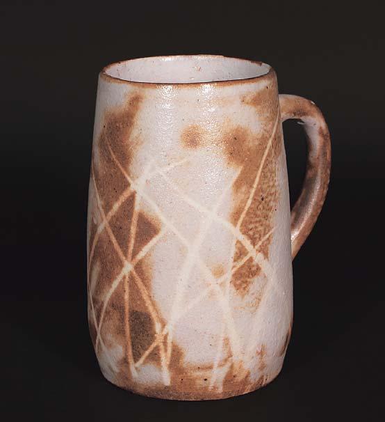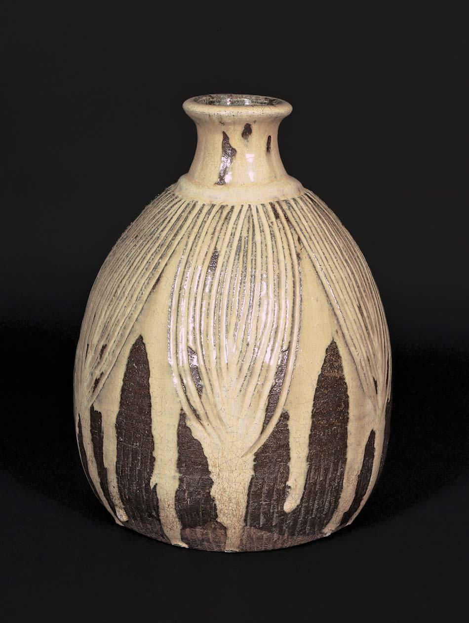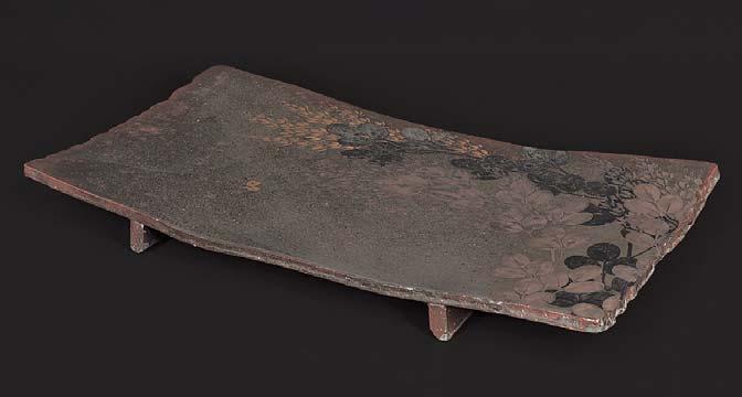 「叩き技法で作られた水指。内部には青海波状の当 て木の跡が残されており、底部は平底で小さな足が三 方に付く。叩きの技法で基本的な形をつくるが、さら に器形を意図的に歪め、線彫り等の装飾を加えている。 (後略)」