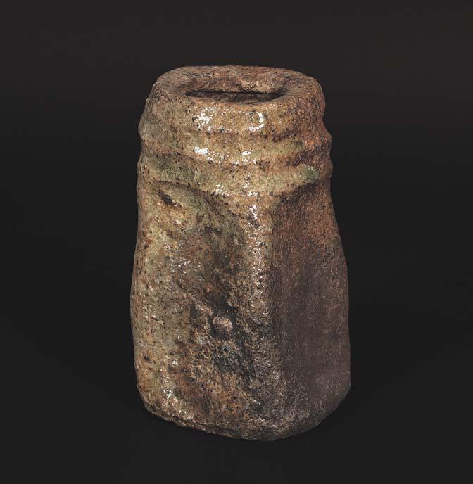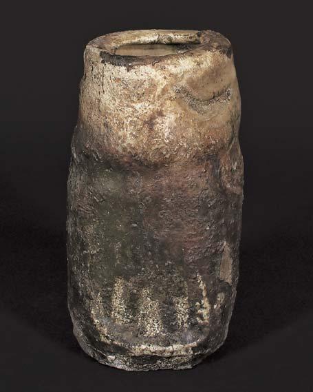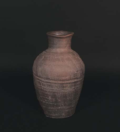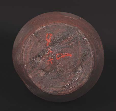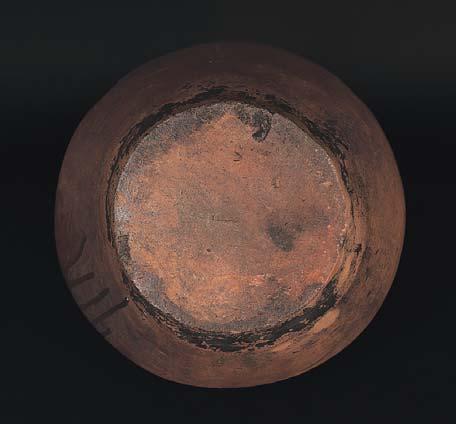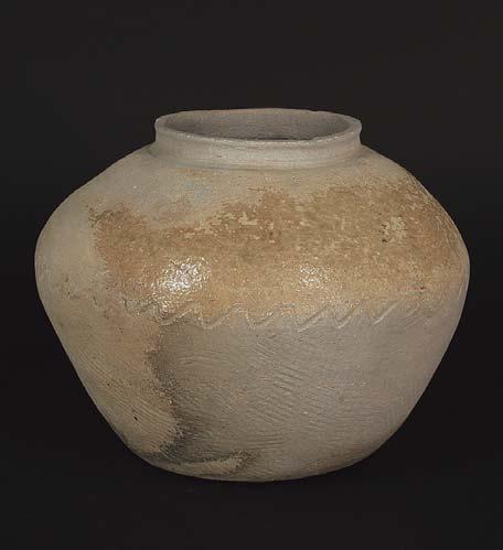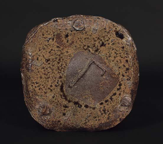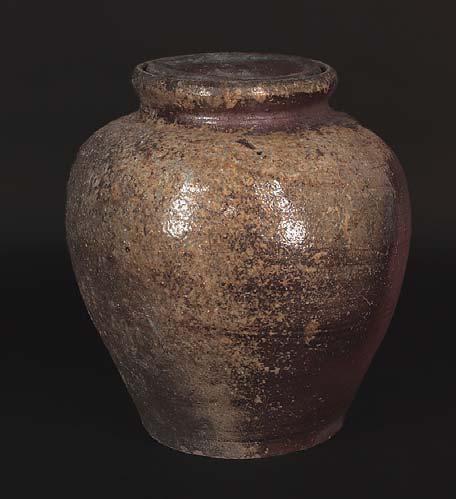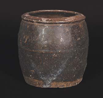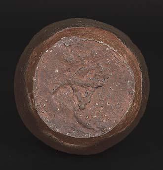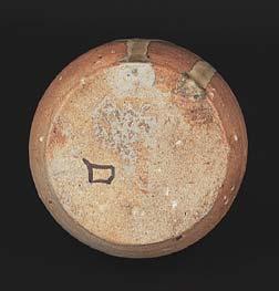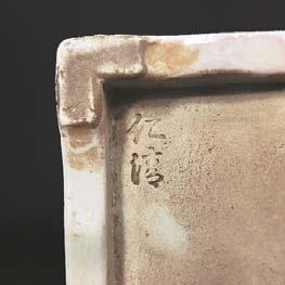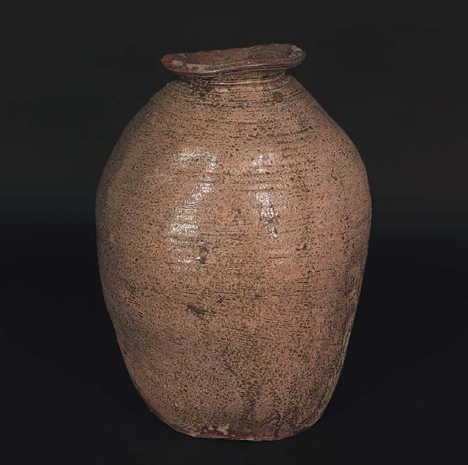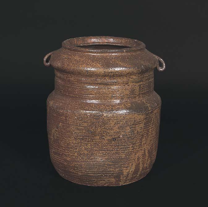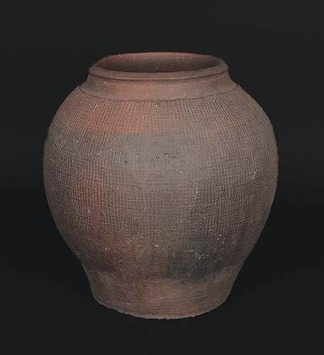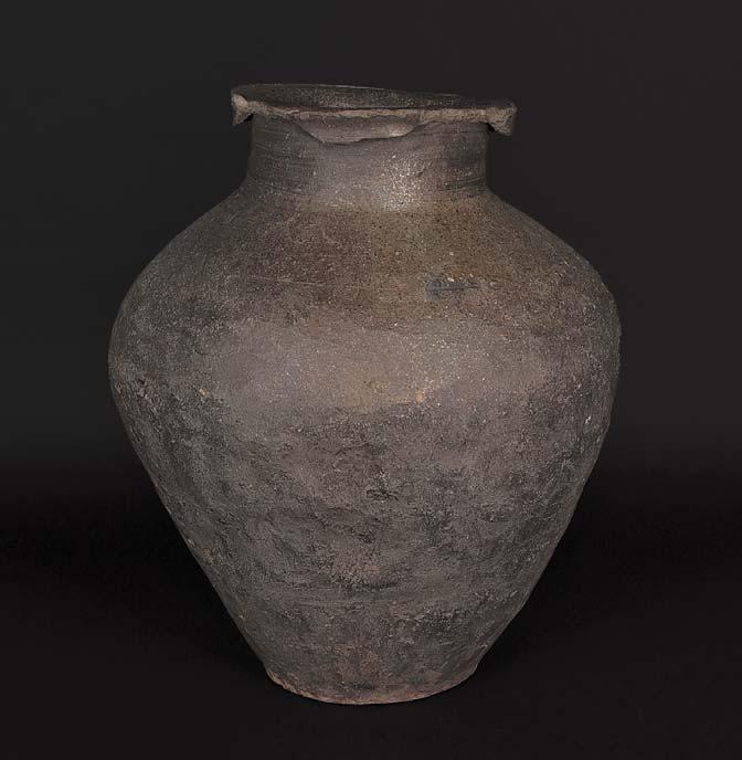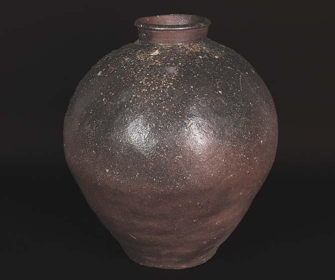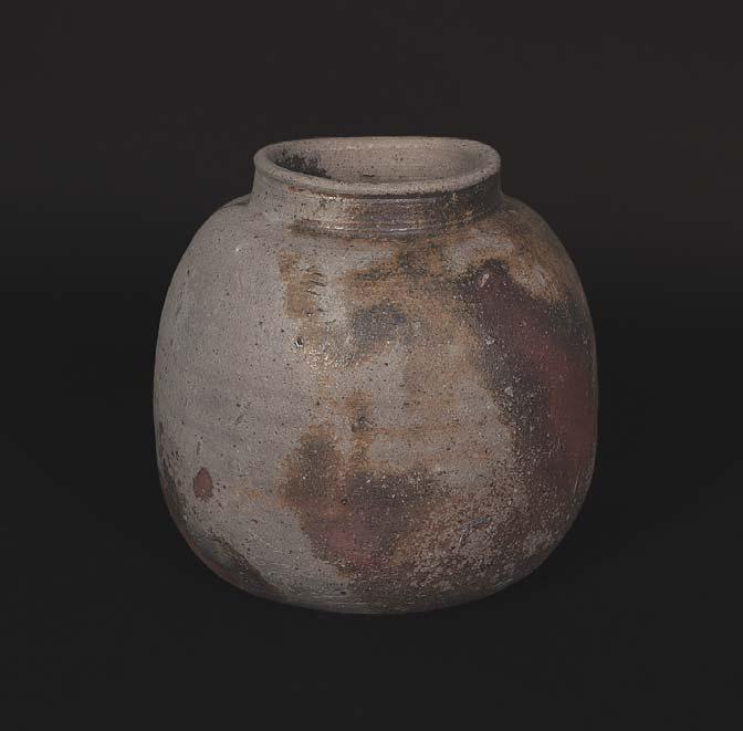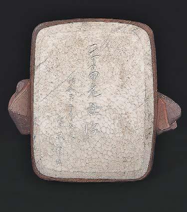 #001 慶長十八年銘唐津三耳茶壺 ¥1,200,000~ 付所載本 30×30×35 口辺欠損 三耳欠失 甕屋ノ谷窯 古法の叩きで整形し、壺の内には叩きに対応する青海波文の痕跡が認められ、茶褐釉を施し、高温 焼成されたことが知られる。そして肩部に釘で横方向に「慶長十八年(1613)五月拾日」の銘文を縦書き に彫る。