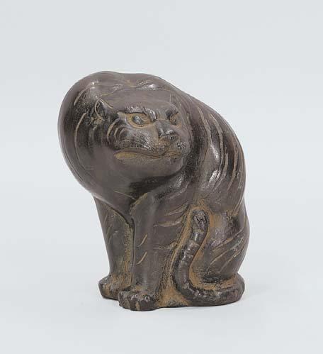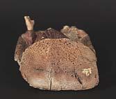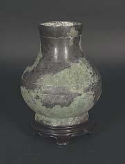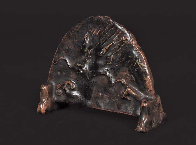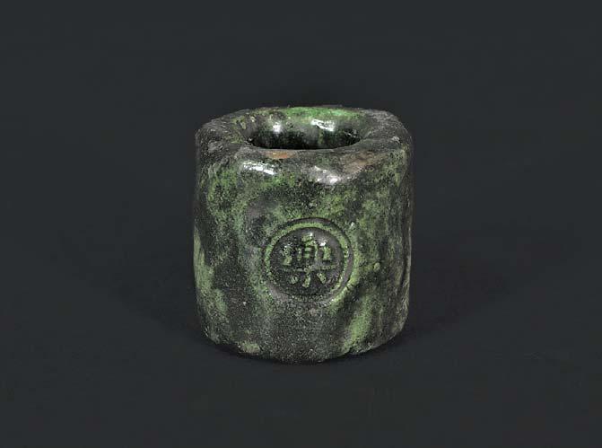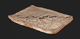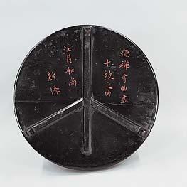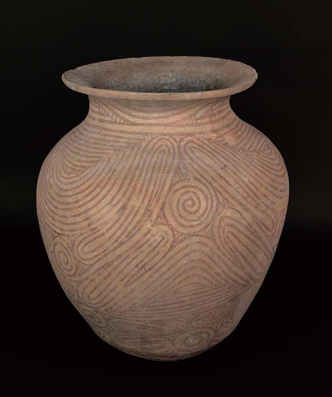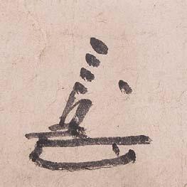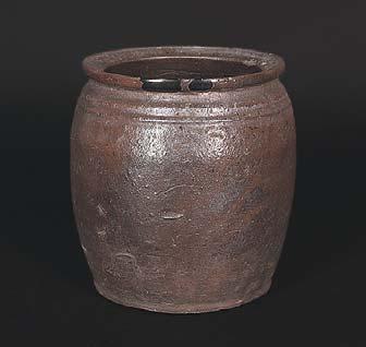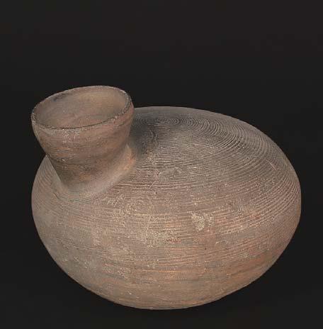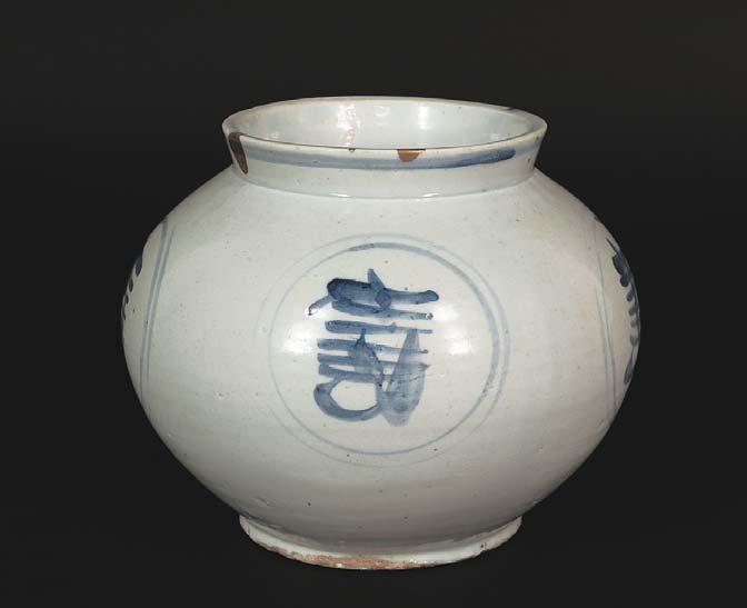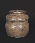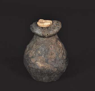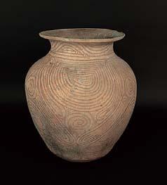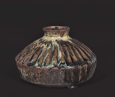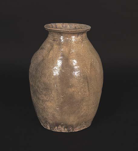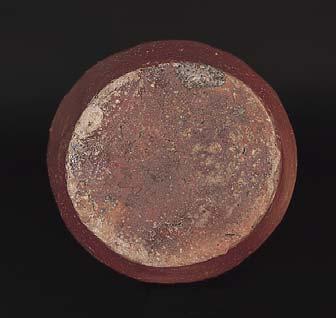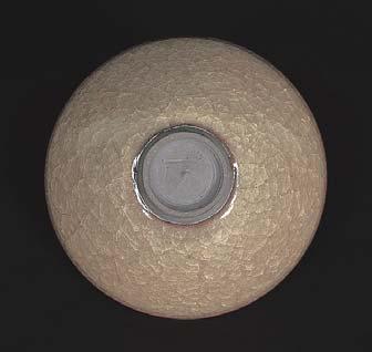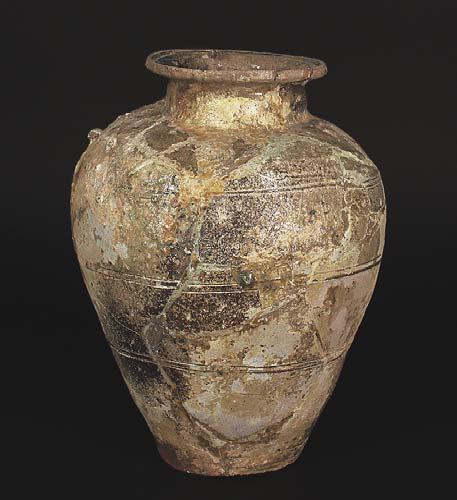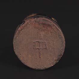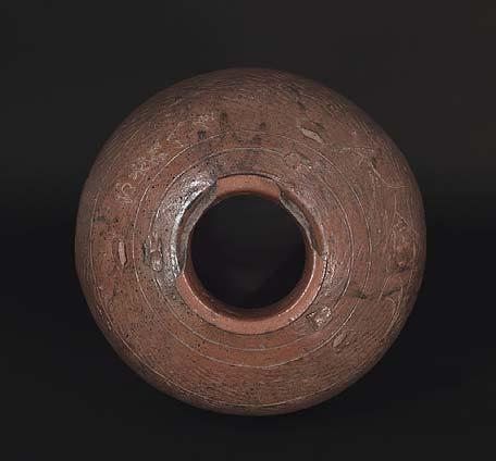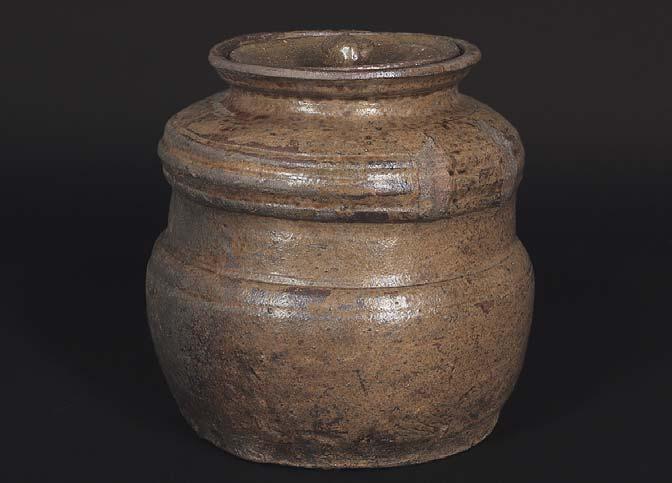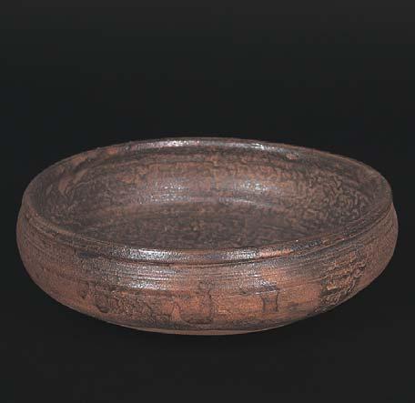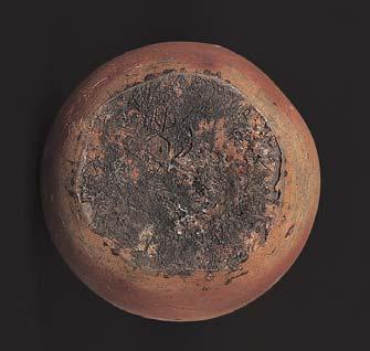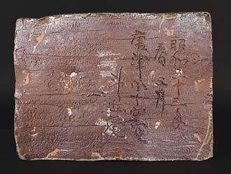 #001 慶長十八年銘唐津三耳茶壺 ¥1,200,000~ 付所載本 30×30×35 口辺欠損 三耳欠失 甕屋ノ谷窯 古法の叩きで整形し、壺の内には叩きに対応する青海波文の痕跡が認められ、茶褐釉を施し、高温 焼成されたことが知られる。そして肩部に釘で横方向に「慶長十八年(1613)五月拾日」の銘文を縦書き に彫る。