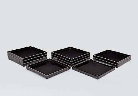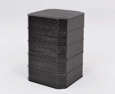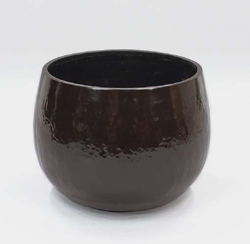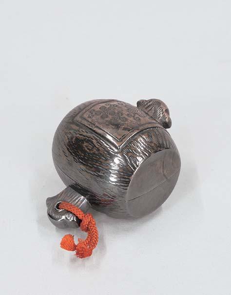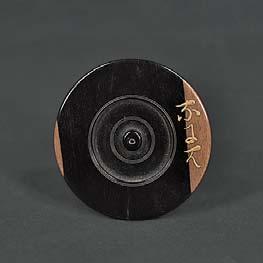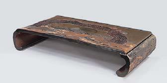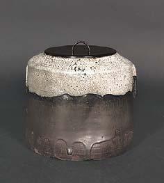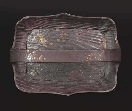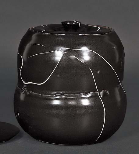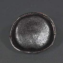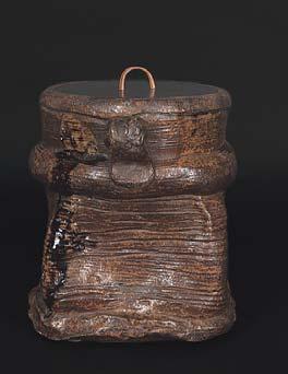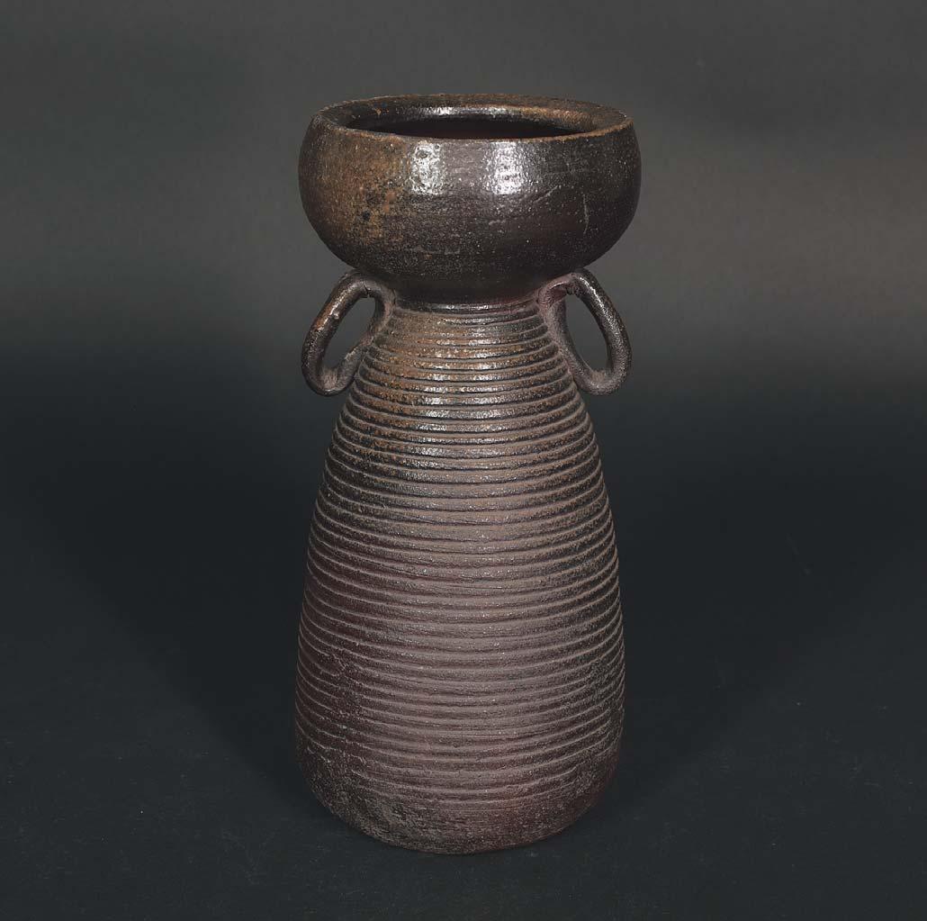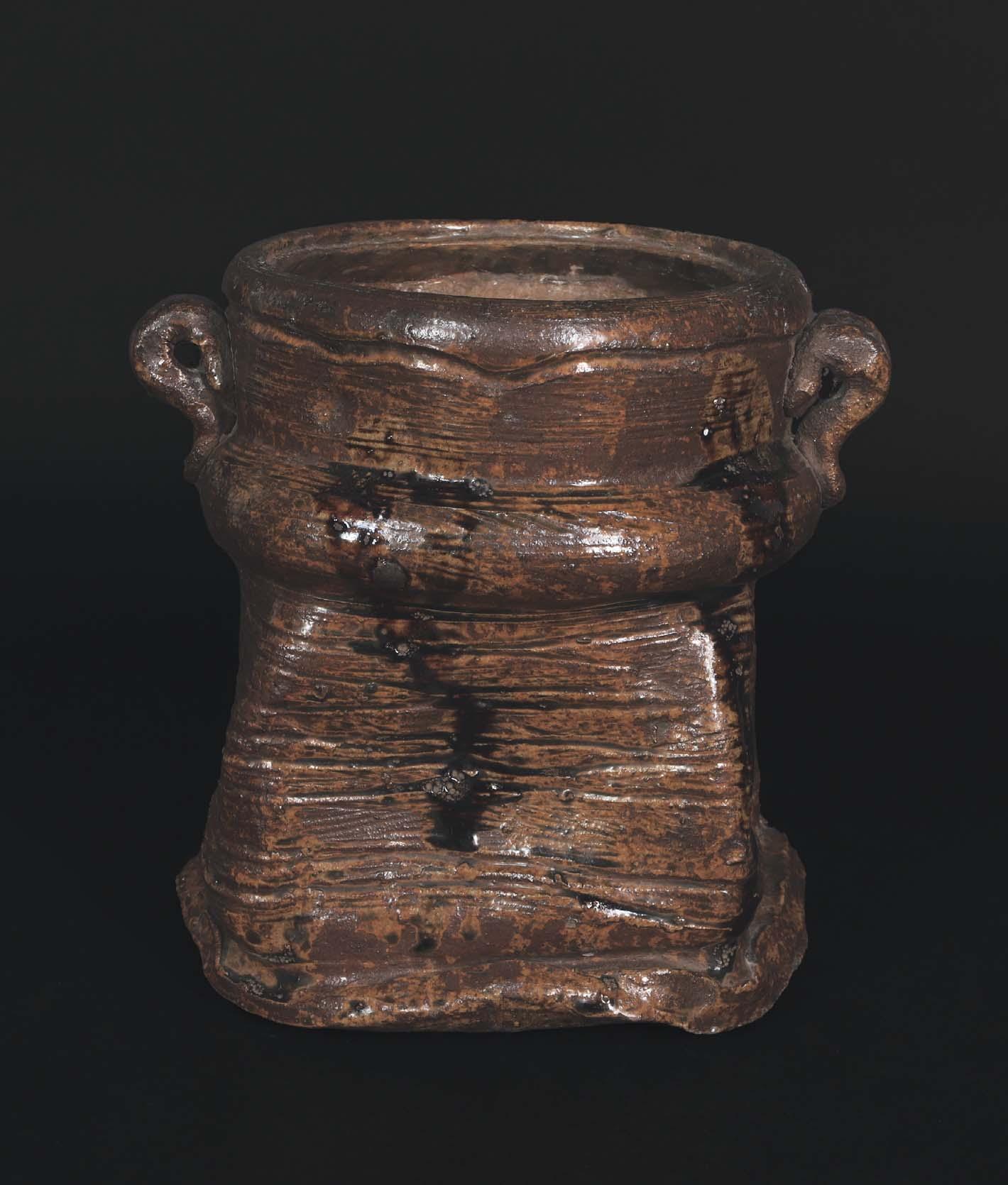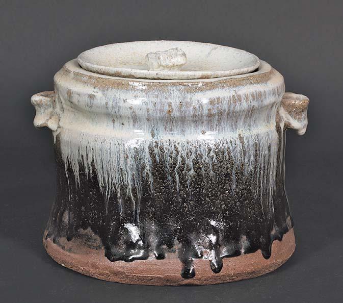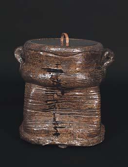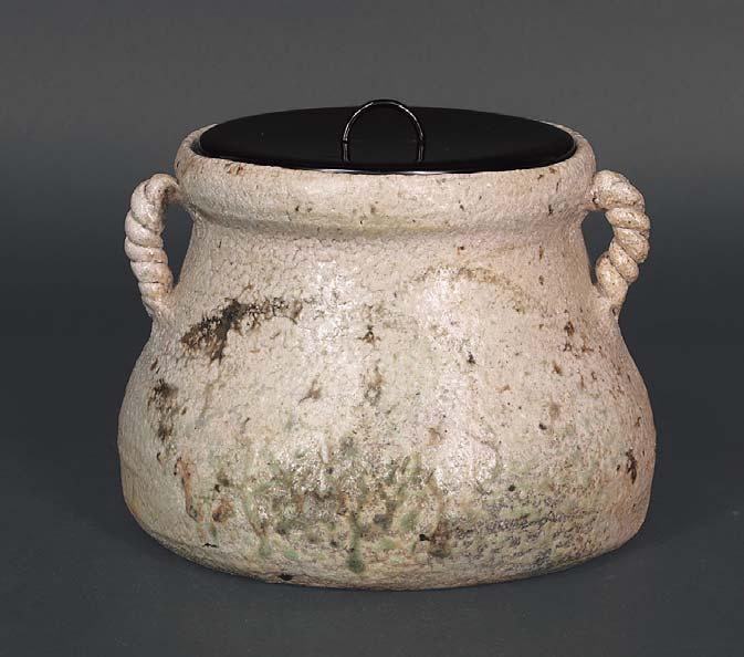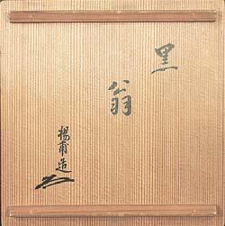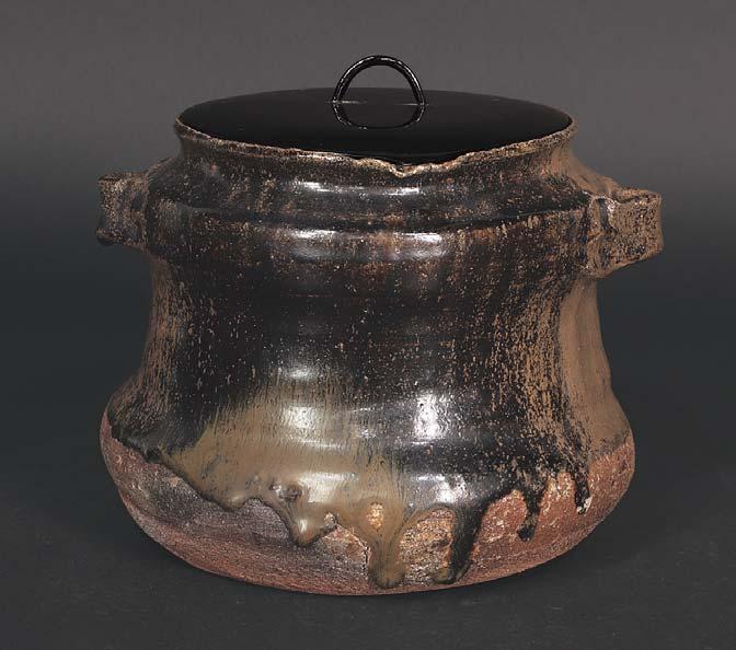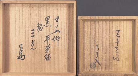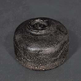 #003 叩黒唐津双耳三足水指 ¥2000000~ 付時代合識箱(桐) 黒塗蓋 20×17×20 甕屋ノ谷窯 掲出は、佐賀県重要文化財に指定されている「鉄釉叩 き耳付水指(銘福の神)」の「同手の水指」とみられる。そ の解説文(『土の美 古唐津』2008 P34)を引用して参考に供し たい。