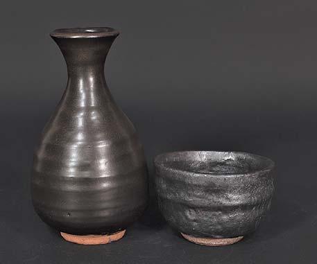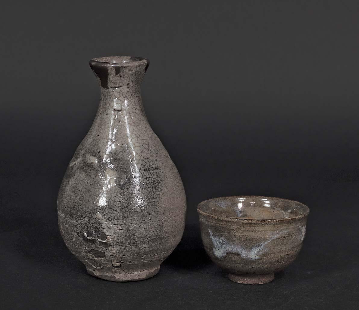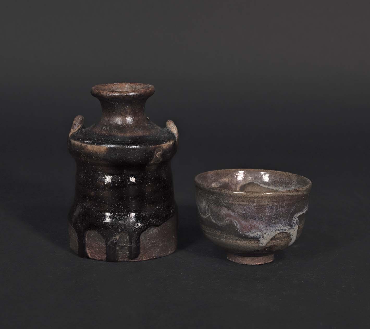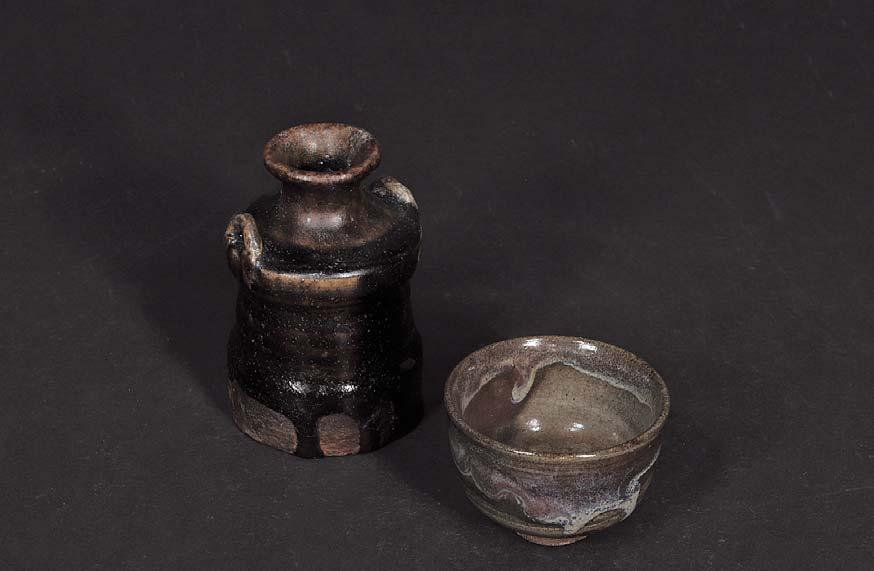#005 黒唐津双耳徳利 唐津辰砂ぐい呑 ¥1,000,000~ 徳利:付識箱(桐) 7×7×105 底窯印 西岡小十箱識 藤ノ川内窯 ぐい呑:付木箱(桐) 仕覆 7×7×5 宇土ノ谷窯(伝世)