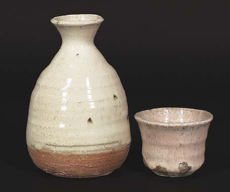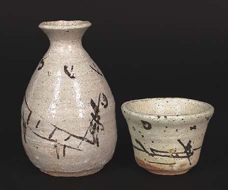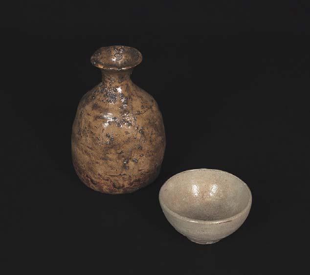 #010 青唐津徳利 唐津山盃 ¥800,000 徳利:付木箱(桐) 9×9×13 口縁金補修 甕屋ノ谷窯 盃:付木箱(桐) 8×8×4 原明窯