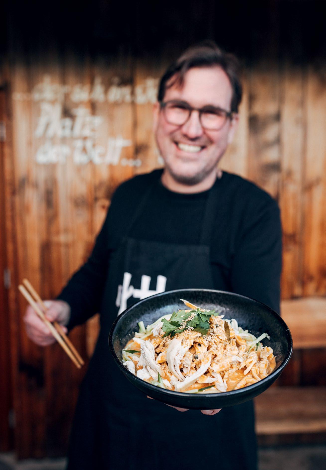 Kunst macht hungrig! Wie immer gibt es ein chinesisches Rezept. Der Koch, Thomas Wrobel, erzählt, wie und wo er zum ersten Mal »Hähnchenstreifen mit seltsamem Geschmack« gegessen hat und was das mit drei Frauen zu tun hat.