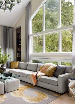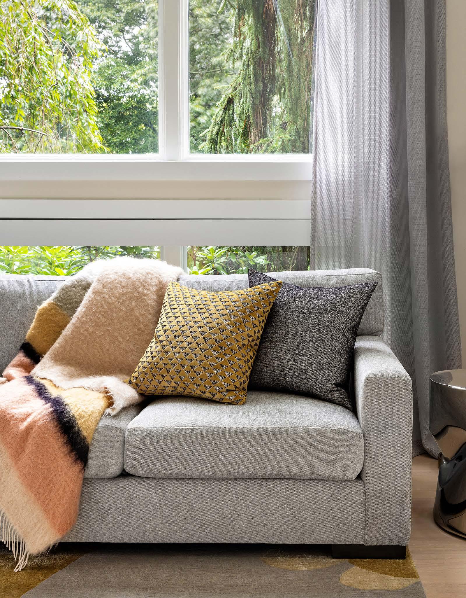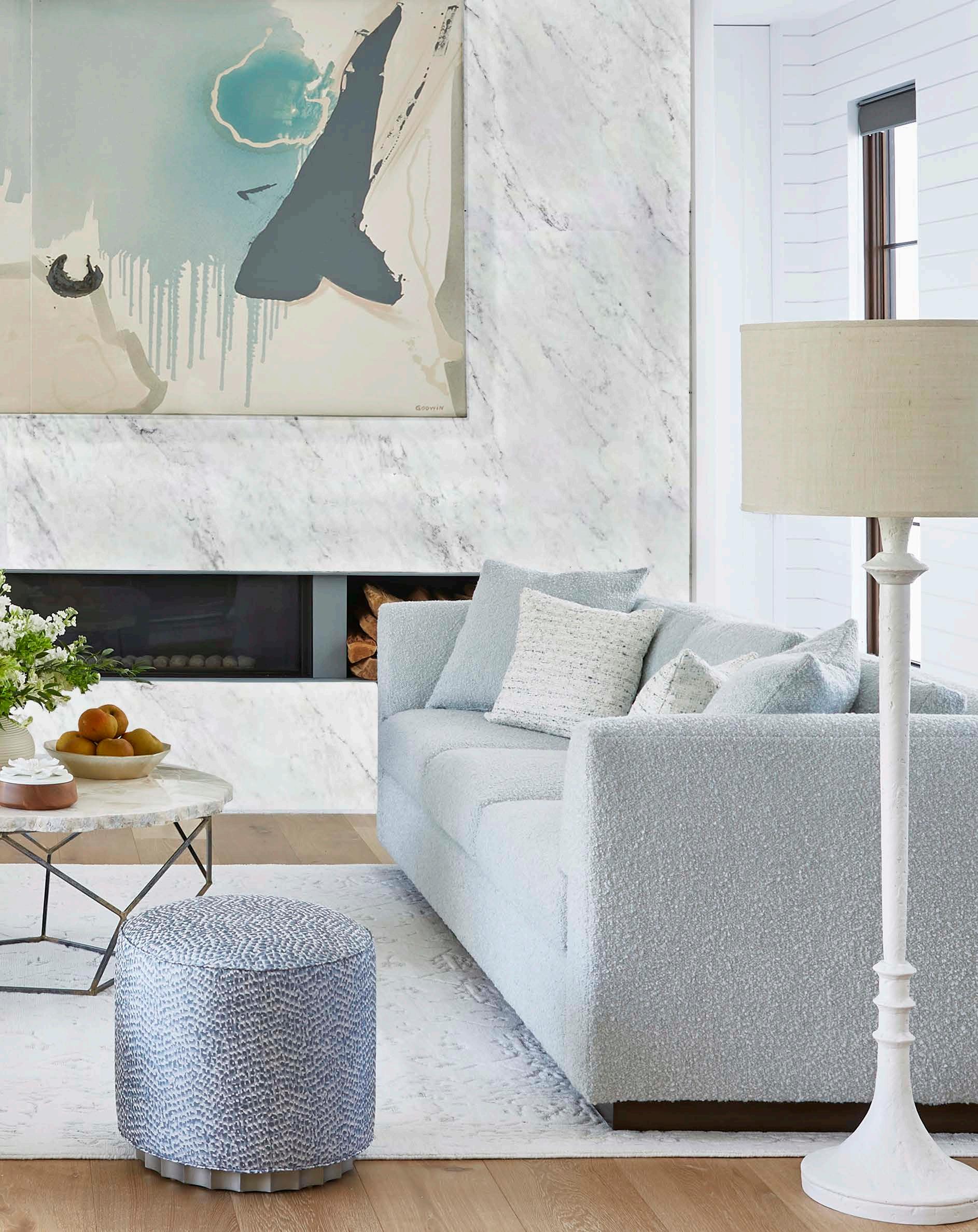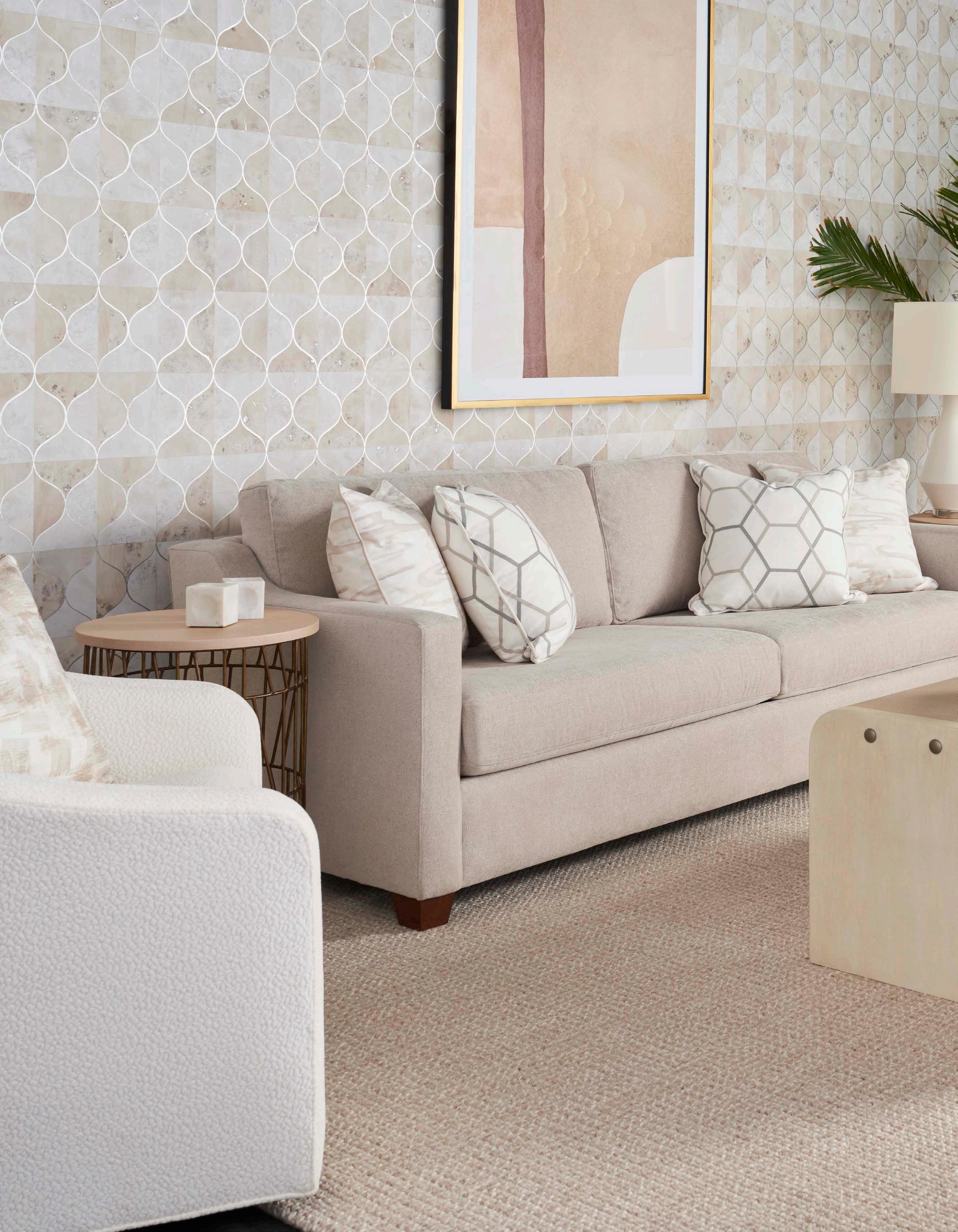 PG 32-33: Denison Chairs S810-CH in Graceful Moves - Ocean, Deal Sofa DS4001-1 in Boucle All Day - Spa, Cuddle Up Ottomans FS475-O in Balancing ActHorizon; Pillows - Vanish.15, Twist and Turn - Seamist, Boucle All Day - Spa; Carpet - Topispetal - Blizzard