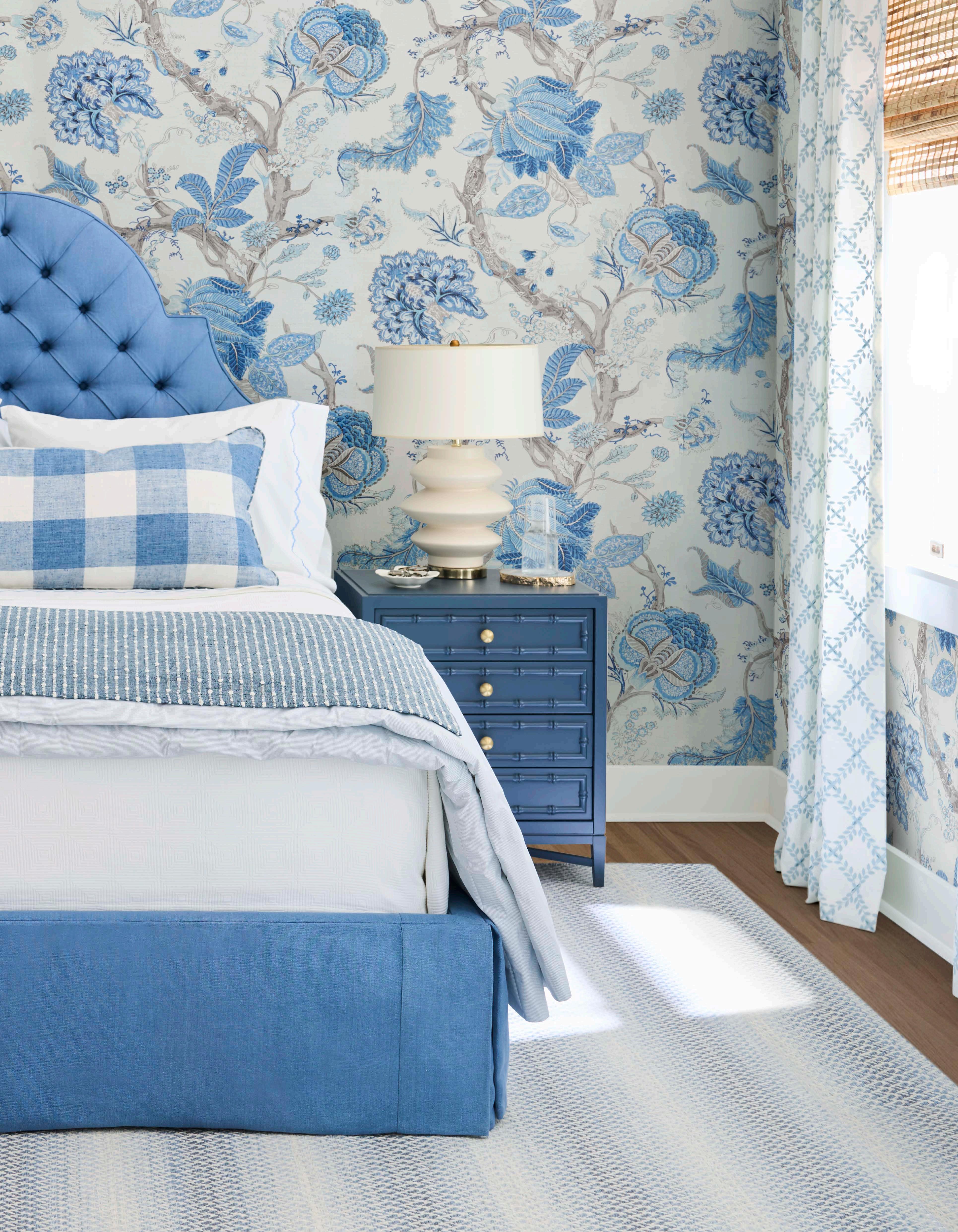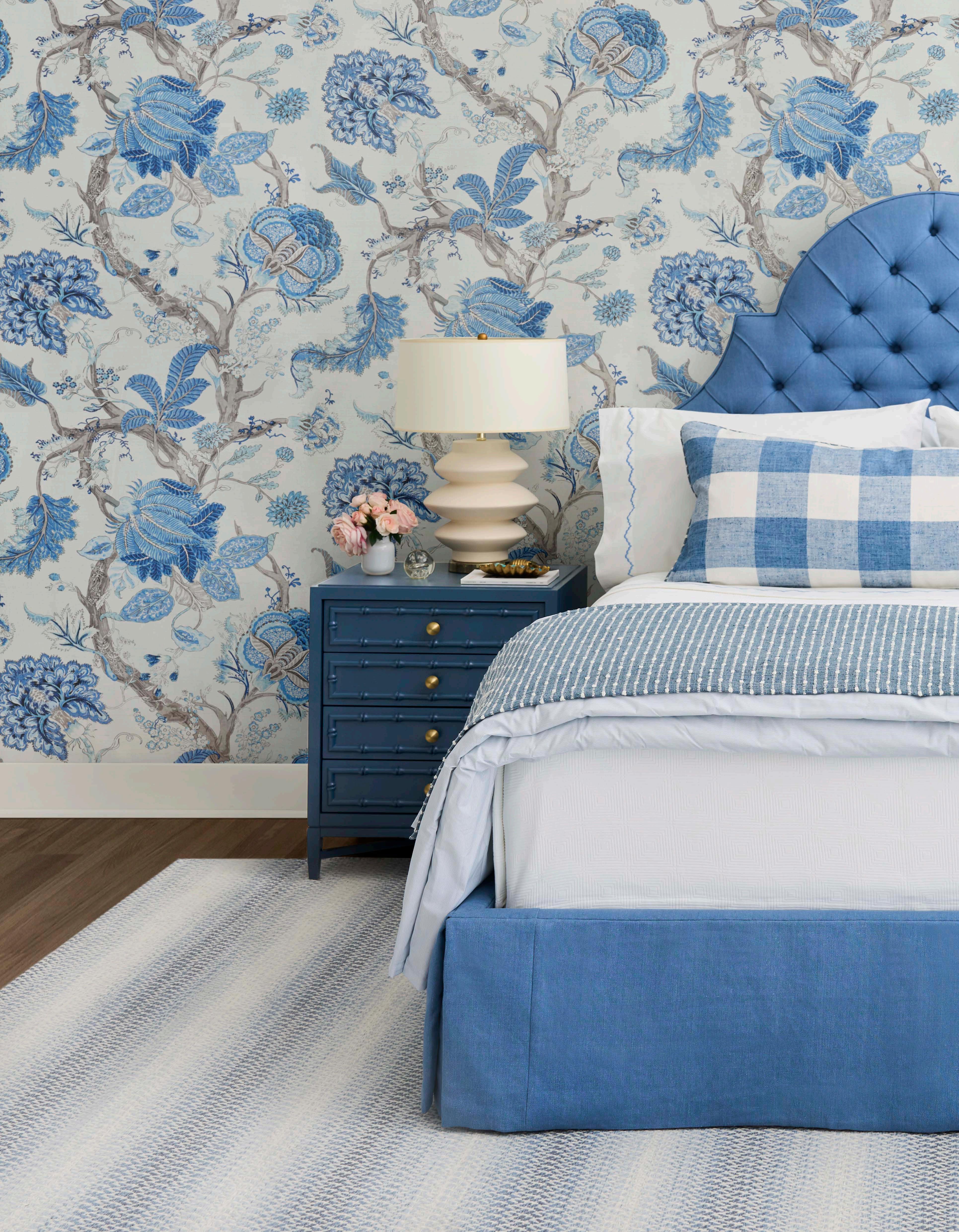 PG 8-9: Sands Point Bed SH5 in Watermill - Denim; Throw 36528.5.0; Pillow - 34090.15.0; Drapery - 37090.5.0; Wallcovering - W4201.155.0; Carpet - San Clemente - Sky