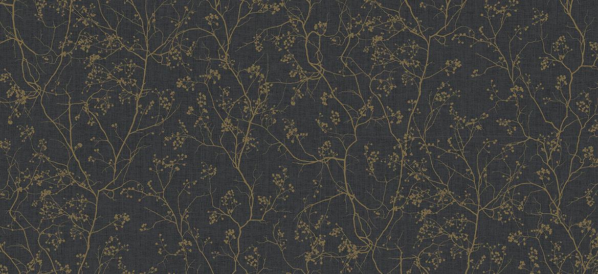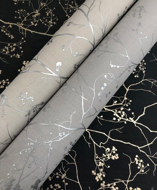 A bouquet of delicate flowers inspires pattern Luminous Branches, created in a silhouette of botanical stems and blooms that are made modern when rendered in metallic foil.