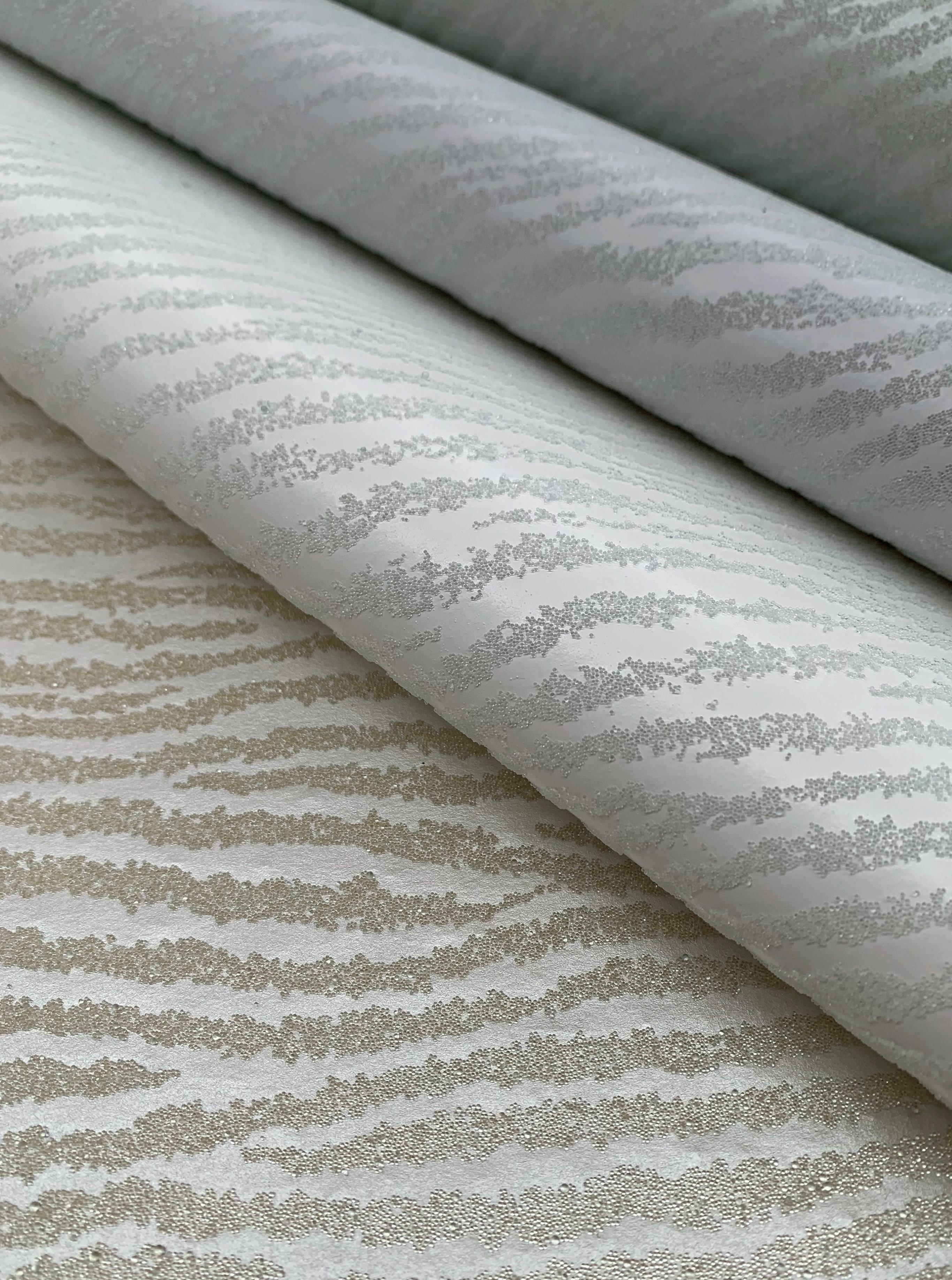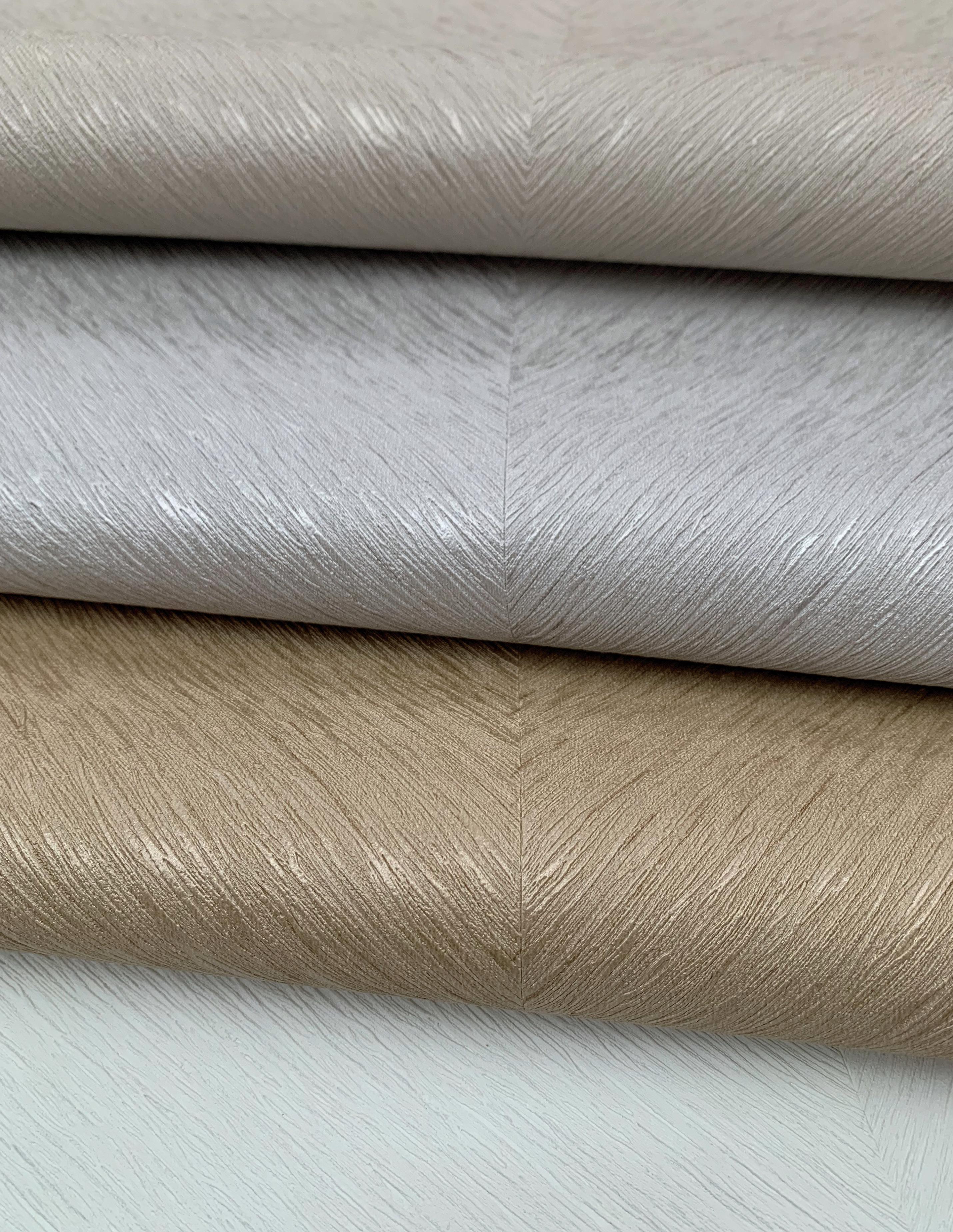 The vertical grain of pattern Natural Texture is transformed from its bark and botanical influences to a glamorous abstract, when rendered in a burnished metallic finish.