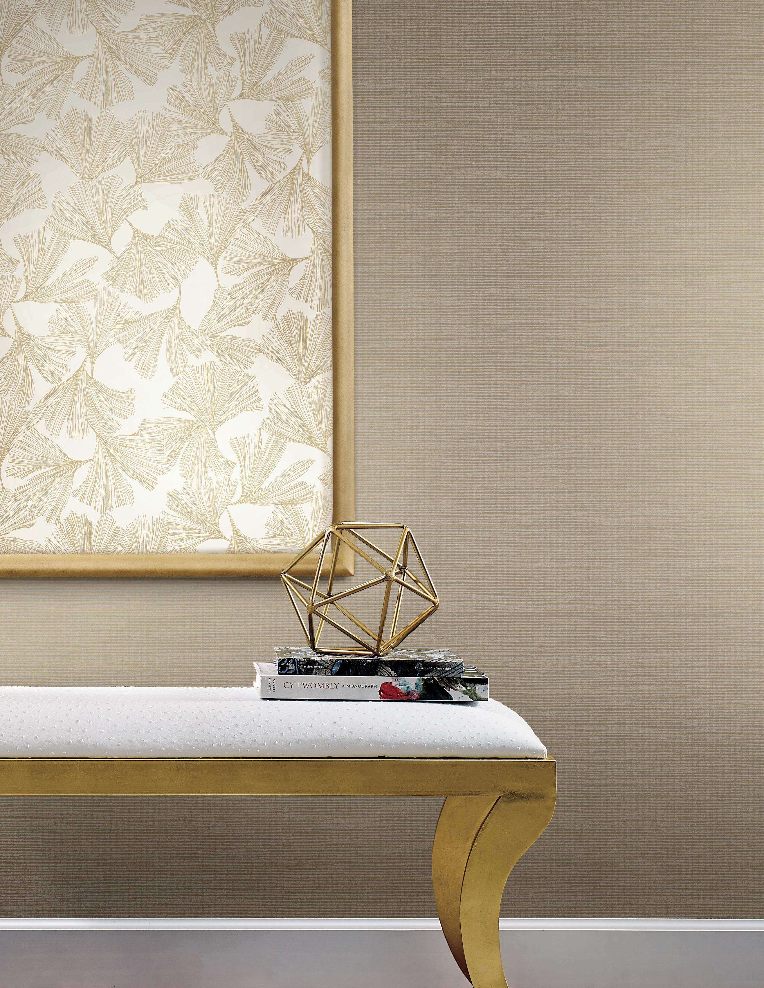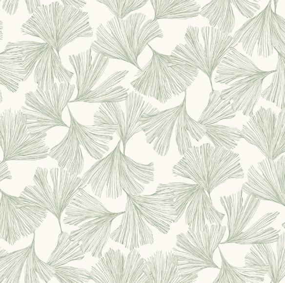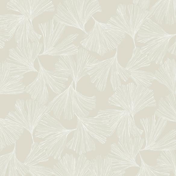 The outline of gently veined leaves float and mingle to form a quiet botanical accented by metallic and matte color in pattern Gingko Toss.