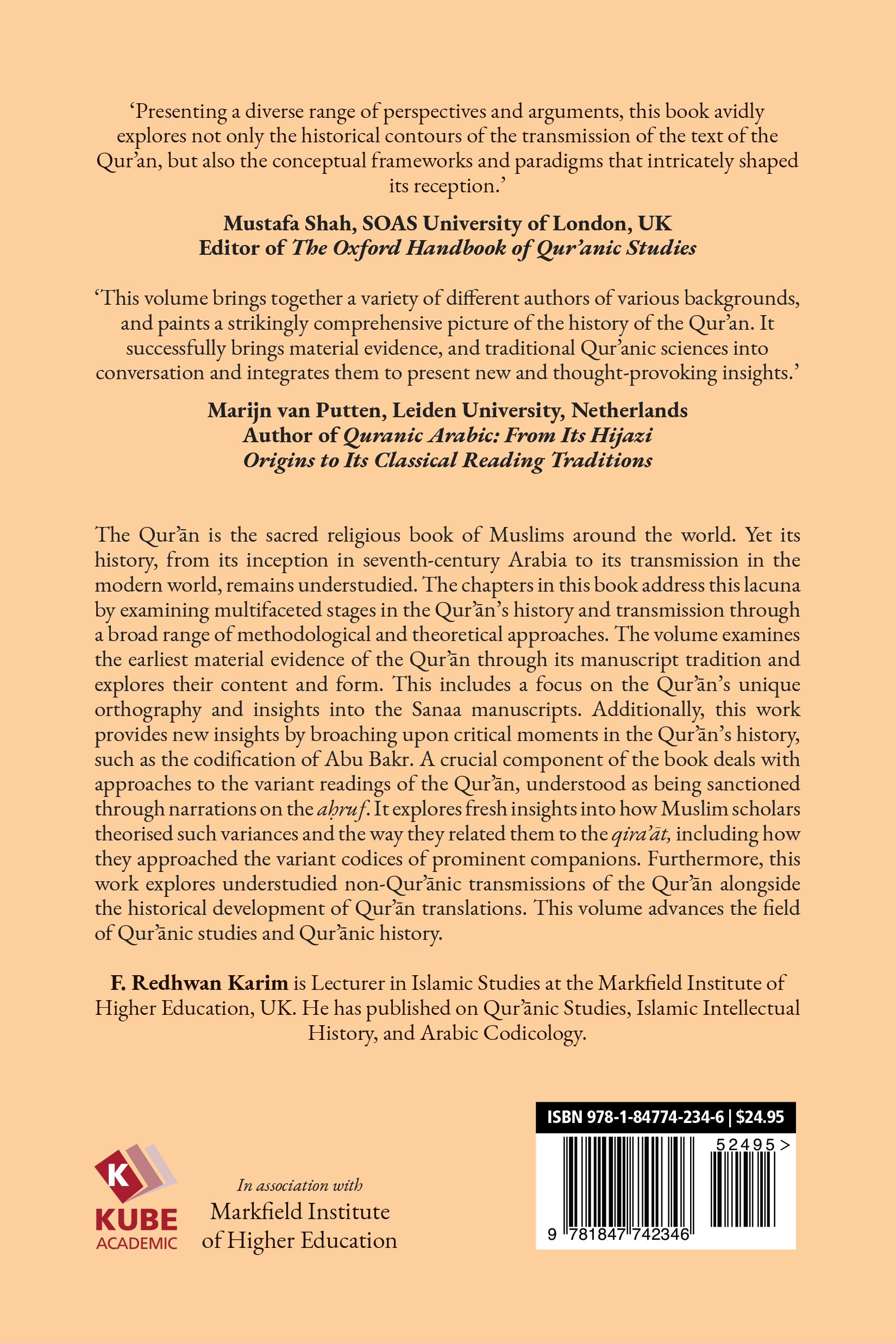 Within Islam, there are multiple areas that are a source of contention and disagreements, whether that be theology, history or law. However, the Qur’ān alone remains unique among all Muslims as an agreed-upon source of revelation and the focal point for all other auxiliary Islamic sciences. Being the focal point of Muslims around the world, both past and present, the contents of the Qur’ān have been the source of earnest examination. Indeed, the exegeses of the Qur’ān, numbering into the thousands, seek to elucidate various facets of the Qur’ān’s content, such as language, historical background of verses, and interpretation. However, the Qur’ān’s journey in history as a book and as scripture remains understudied. In this present volume, the transmission and understanding of the Qur’ān in history is explored, through the adoption of various methodological approaches whether that be through manuscript studies and codicology, or literary analysis and intellectual history. In doing so, this present volume hopes to provide and contribute towards the construction of the history of the Qur’ān. The overarching nature of the Qur’ān is represented in the makeup of the volume by drawing upon the expertise of scholars, not just based in the West, but throughout the world.