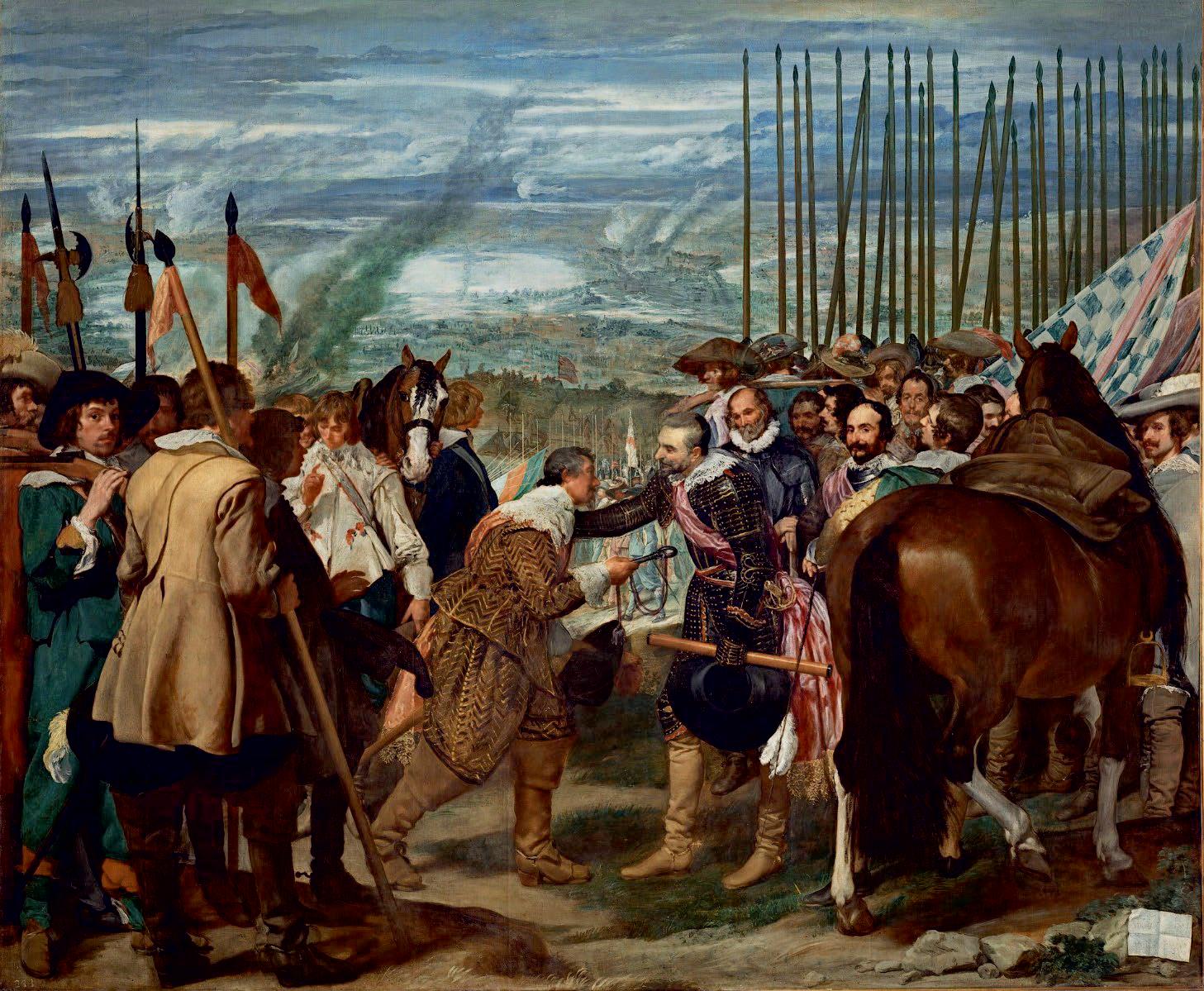 Der Friede von Münster. Sechs Niederländer und ein Spanier beschwören am 15. Mai 1648 im Rathaus zu Münster die Hände den spanischniederländischen Friedensvertrag; Gemälde Öl auf Kupfer von Gerard ter Borch (1617-1680); Reichsmuseum, Amsterdam, gemeinfrei