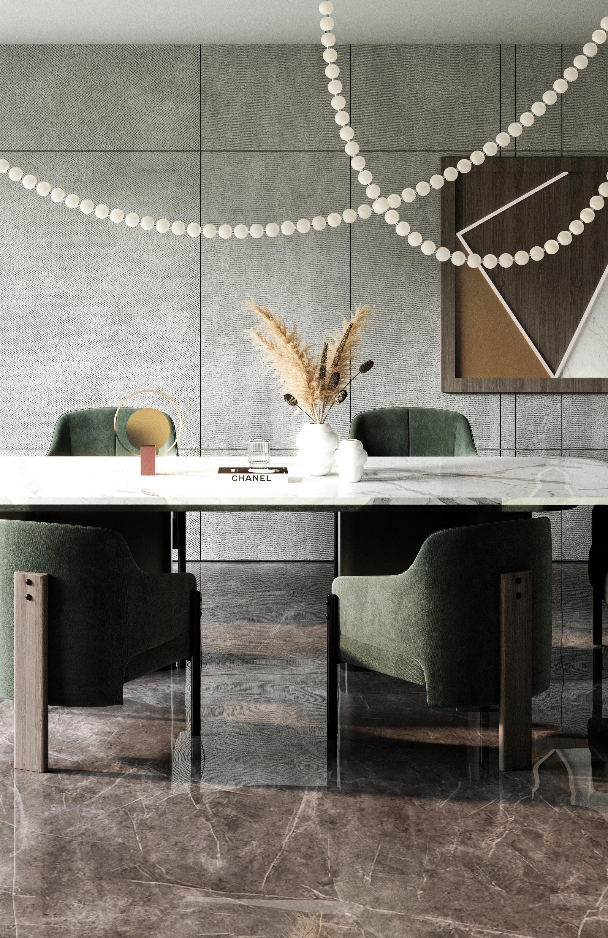A touch of artisan detailing truly makes a room feel alive. The Alora collection features several unique materials that create a statement in anywhere, including vegan leather, brushed textural finishes, ribbed crystal, and more. These details thrive in environments with neutral color palettes, strong architectural details, and a mix of finishes throughout a space.