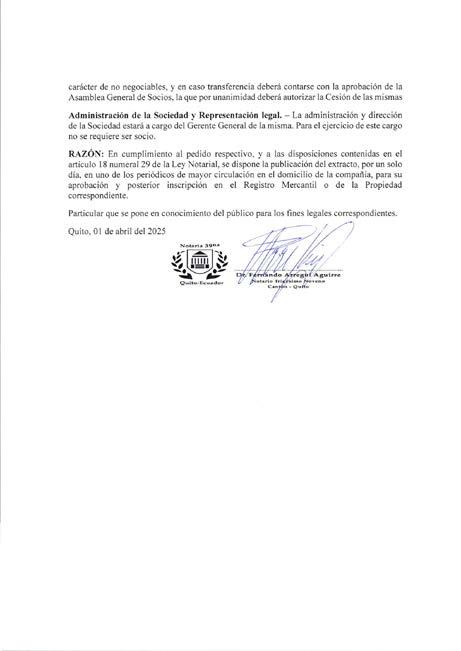 Conforme lo dispuesto en el Reglamento sobre juntas generales o asamblea general de socios y accionistas de las compañías de responsabilidad limitada, anónimas, en comandita por acciones, de economía mixta y sociedades por acciones simplificadas, expedido por la Superintendencia de Compañías, Valores y Seguros, los accionistas minoritarios que sean titulares de por lo menos el cinco por ciento del capital social podrán solicitar, por una sola vez, la inclusión de asuntos en el orden del día de la junta general, para tratar los puntos que indiquen en su petición, o que se efectúen correcciones formales a convocatorias previamente realizadas. Este requerimiento deberá ser efectuado al Presidente de la Compañía, cargo que actualmente lo ejerce quien suscribe la presente convocatoria, dentro del plazo improrrogable de 72 horas, contado a partir de la fecha de la misma. Quito DM, 10 de abril del 2025