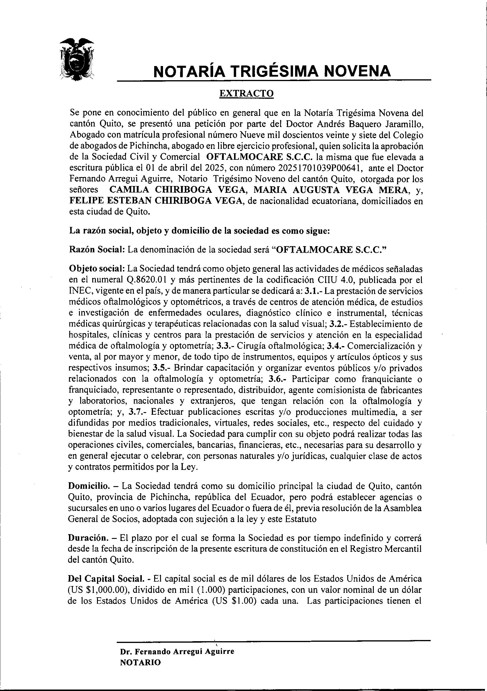Se convoca especial e individualmente a los Comisarios y Órganos de Fiscalización, para que, de conformidad con el estatuto social de la compañía, asistan la referida reunión. La información relacionada a los puntos del orden del día, estará a disposición de los señores accionistas en las instalaciones de la compañía, ubicada en la ciudad de Quito, Provincia de Pichincha, en las calles Francisco Arízaga Luque Para los accionistas que deseen participar de la Asamblea General Ordinaria, de forma telemática, pueden realizarlo a través del siguiente enlace: reunión de https://us06web.zoom.us/j/81818333160?pwd=jJQ9mqG0bZLaknB2L2USRa ID de reunión: 818 1833 3160 Código de acceso: 614755. Los votos se realizarán y ejercerán de conformidad con el estatuto y la ley de compañías. Se les solicita confirmar su asistencia al siguiente correo electrónico: francisco@ ; y/o al siguiente número telefónico: 0995698741 hasta el día 18 de abril de 2025. Para los accionistas que hayan optado por decidir por enviar en representación a terceros, se receptarán las respectivas cartas poder en