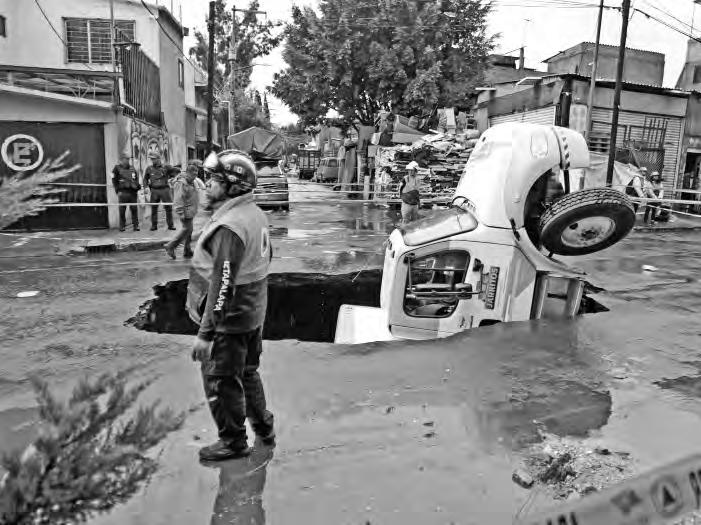 ▲ Un camión de reparto de Jarritos cayó en una oquedad de ocho metros de profundidad que se formó por la ruptura del drenaje en la colonia Renovación, de la alcaldía capitalina. El vehículo se hundió