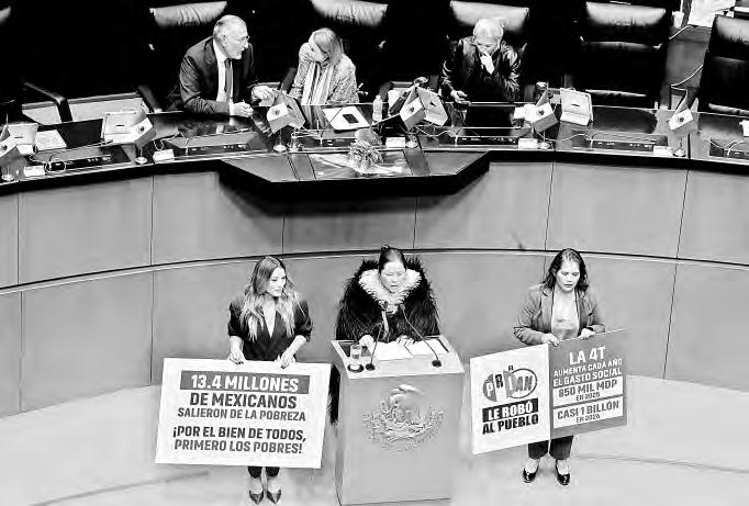 Ofreció a los legisladores un panorama general del estado del país, en el cual destacó que no sólo el peso está fuerte frente al dólar, sino que el país cuenta con altos niveles de inversión extranjera directa y actividad turística, y con programas sociales que atienden las necesidades de la población de menores recursos. En respuesta a una pancarta colocada por la bancada del PAN al pie de la tribuna, donde se leía la frase “110 mil desaparecidos”, Rodríguez Velázquez apuntó que en la actual administración se reforzó la capacidad de búsqueda de las personas desaparecidas, luego de realizar un “proceso inédito de escucha activa” con más de 450 colectivos, de donde surgieron 570 propuestas.