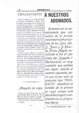 La materialización de esta escritura se llevó a cabo principalmente, como ya se dijo, a través de las páginas de periódicos como Regeneración, un semanario que habría de conocer cuatro distintas épocas de publicación, entre 1900 y 1918, debido al cierre de sus instalaciones, incautación de sus imprentas o a las distintas formas de represión hacia sus directores y/o colaboradores.
