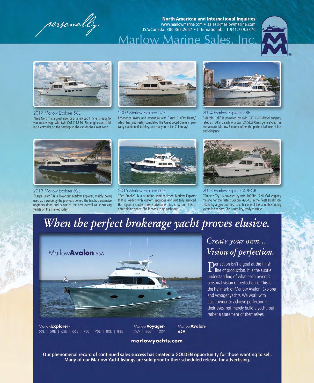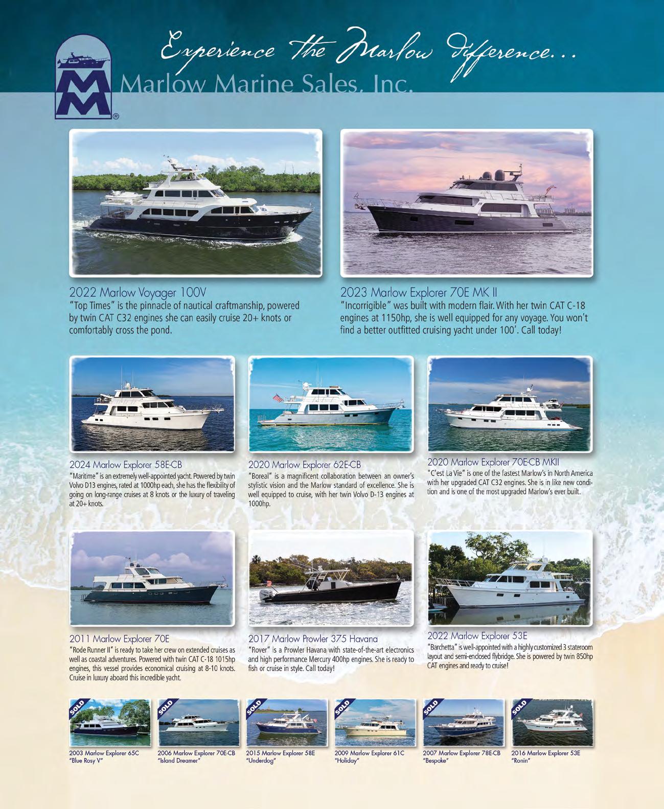 2000 OCEAN YACHTS 48 SUPER SPORT FLY BRIDGE Beautiful salon with pull-out sofa, fully-equipped galley, three staterooms, two heads. Two Caterpillar diesel engines delivery impressive speed and handling. Past and current maintenance records available. Asking $349,000. Contact Norm Baur: 216-644-9366 or nbaur@ baymarine.net. BAY