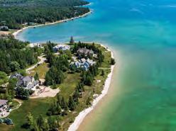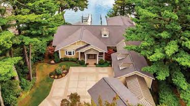Vaulted ceilings with custom trusses, a cozy fireplace and stunning views of Lake Charlevoix are on display in the great room. A well-equipped kitchen is ready for hosting, offering high-end appliances, a spacious butler’s pantry and a 144bottle Sub-Zero wine cellar. Thoughtful finishes throughout the home include Brazilian cherry floors in the dining room, built-in storage and a stunning primary suite made for relaxing. A fireplace warms the primary bedroom, and French doors lead to the outdoor deck. The ensuite bathroom and large walk-in closet offer comfort and convenience. Enjoy striking views from the home office, or