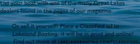 Lakeland Boating (ISSN 0744-9194) Copyright 2023, by O’Meara-Brown Publications, Inc. is published eleven times per year (except December) by O’MearaBrown Publications, Inc. • Business/Accounting and Editorial Offices: 1555 Sherman Ave. Suite 313, Evanston, IL 60201, 312-276-0610. • Call 847-5048475 to subscribe. Lakeland Boating, P.O. Box 386, Lincolnshire, IL 60069 (U.S.). Annual subscription rates: United States: $24.95 per year; International and Canadian: $39.95 per year, includes 7% G.S.T. tax (G.S.T. 894095074-RT 0001) and $12 postage included. Single copies are $4.99 for U.S. and Canada. Only U.S. funds are accepted. Periodical postage paid at Evanston, IL and additional mailing offices. • POSTMASTER: Please send address changes to Lakeland Boating, P.O. Box 386, Lincolnshire, IL 60069. • Lakeland Boating is a registered trademark of O’Meara-Brown Publications, Inc., Evanston, IL. Published as Lakeland Yachting 1946-1955. • Unsolicited work may be submitted at the creator’s own risk. Lakeland Boating assumes no responsibility or liability for unsolicited material. All submissions must be accompanied by a self-addressed envelope with sufficient return postage. All published photos are courtesy of the manufacturer, unless otherwise noted.