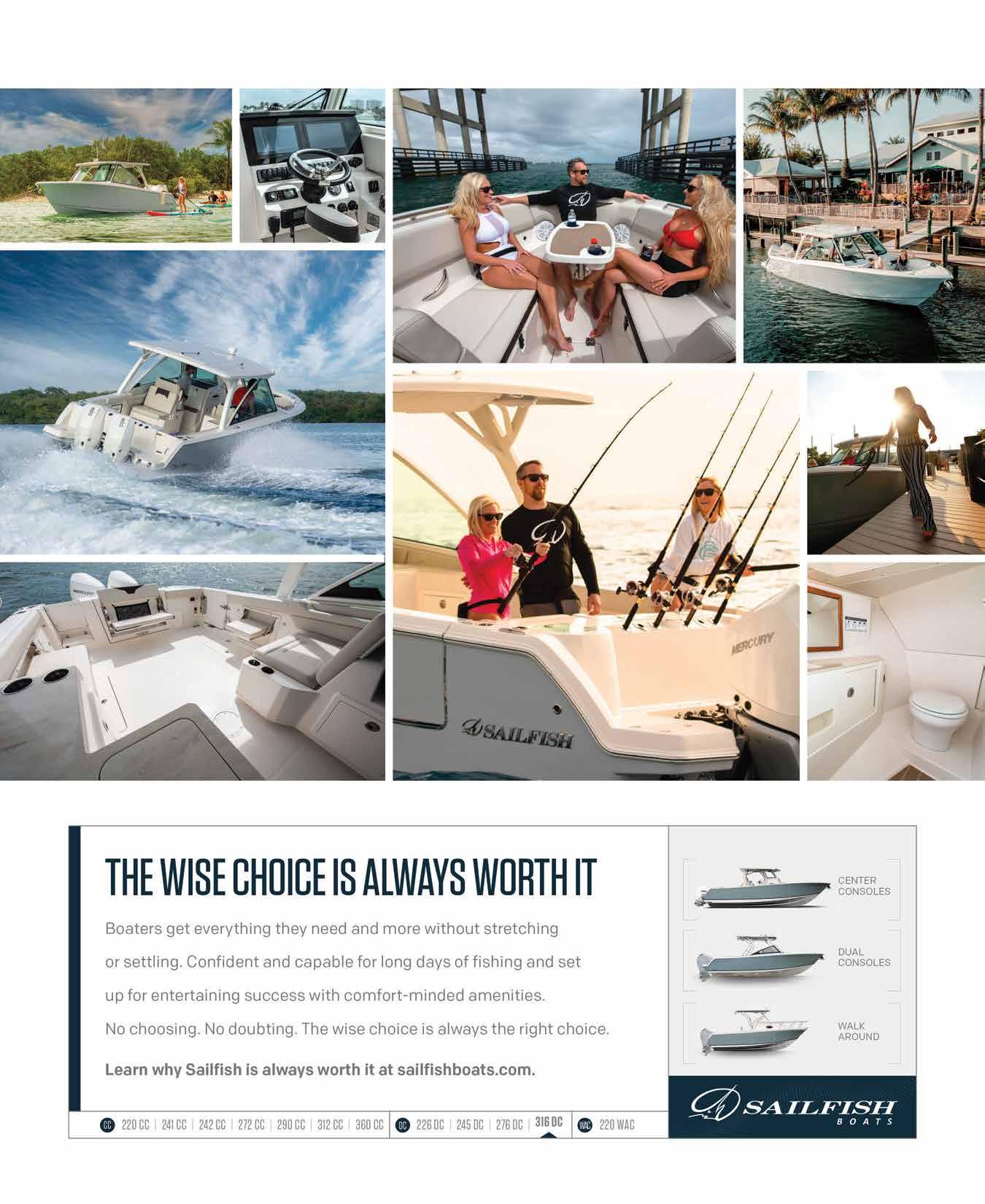 We packed three Boat Tests into this issue! The cover star, the Sunseeker Manhattan 55, is a great cruising yacht in a size that’s easy to handle (p. 28); the newly released Tiara Yachts 48 LE is a luxury cruiser that’s built around Mercury’s V12 outboards (32); and the Sailfish 226 DC is a fun entry-level sports utility vehicle (p. 36).