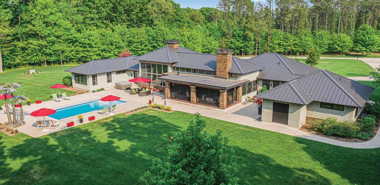 Connecting the indoors to the outdoor saltwater pool and hot tub, a three-season room features a grilling and dining area to cook alfresco. Back inside, a lower level features a game room, theater/