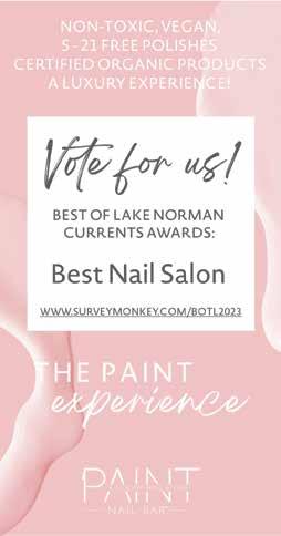 — LH Co-Editor Lori Helms Lori@LNCurrents.comtoo early to cast your votes. Vote for your favorite Lake Norman business, health club, performance venue, dining spot and more. Voting runs through June 30, so you have plenty of time to get as many votes in for your favorite business as possible! Winners will be revealed at a special ceremony to be announced soon. Winners will also be showcased in our August issue and will receive a Best of Lake Norman “CURRENTS” trophy along with an award certificate to hang prominently in your business!