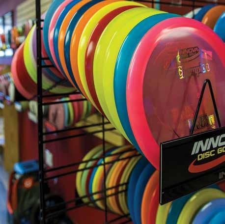 Whether you’re just getting started or ramping up your game, you’ll want to visit Chain Reactions. Peterson carries everything from Innova, Dynamic and DiscMania discs to used ones that start at just $3.99. He recommends beginning with slower-speed, lighter discs, and going heavier as you gain power. If you’re inter ested in lessons, the store’s associate “Bobcat” Buckley can help. They can also equip you with full disc pro attire, bags, shirts and hats. Check out their website to meet their tournament team.