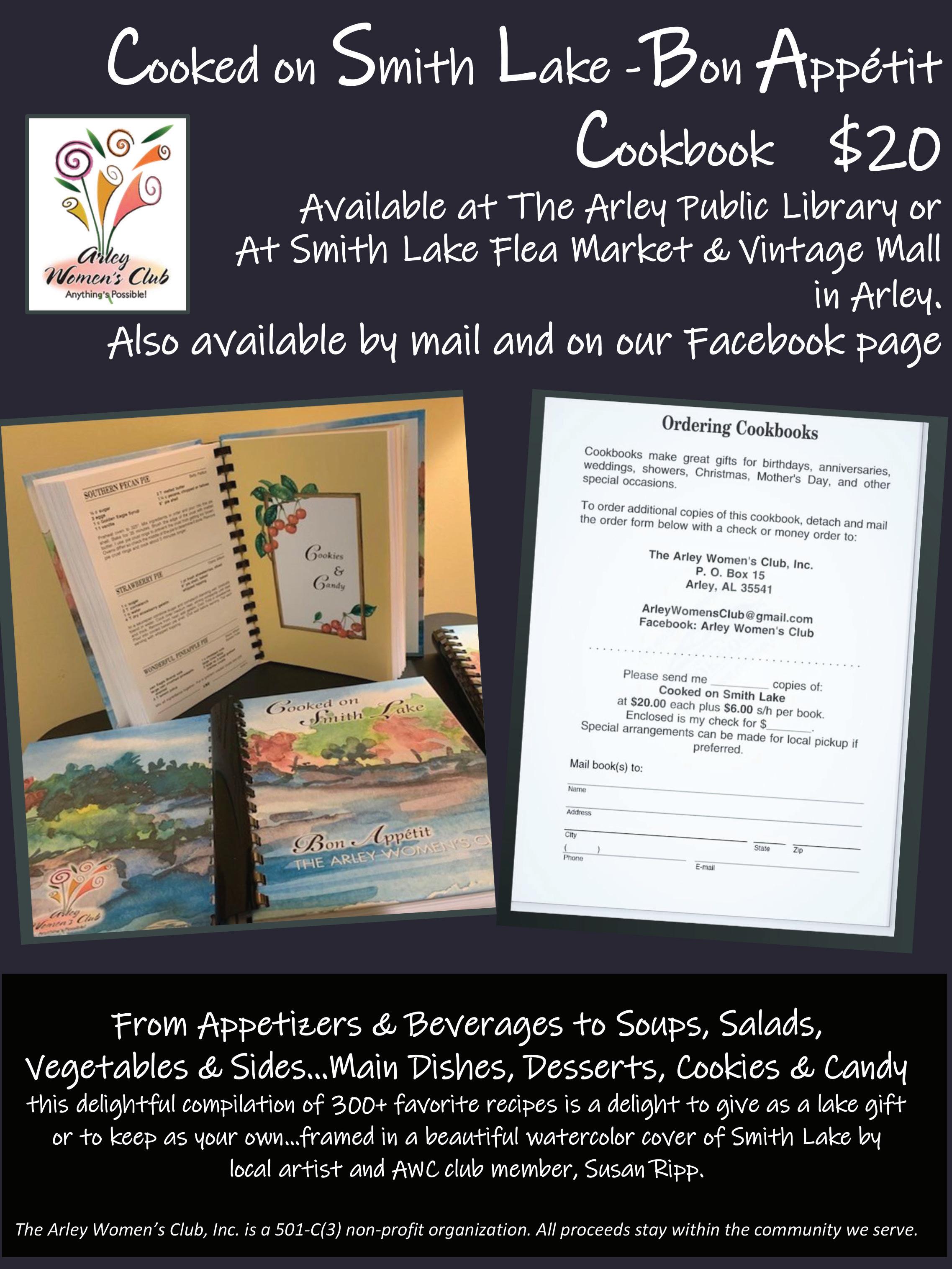 Also, speaking of Arley Women’s Club, we’ve got one of their cookbooks in our kitchen, and enjoy trying out new recipes quite often. Everything we’ve attempted has been wonderful. We’ve even bought a few of these cookbooks to give away as gifts to friends who visit. Pick up one of these recipe books soon, especially knowing they support such a great local organization that does so many incredible things for the lake community and Alrey, AL, “The Heart of Smith Lake.” Just contact the Arley Women’s Club through their Facebook page.