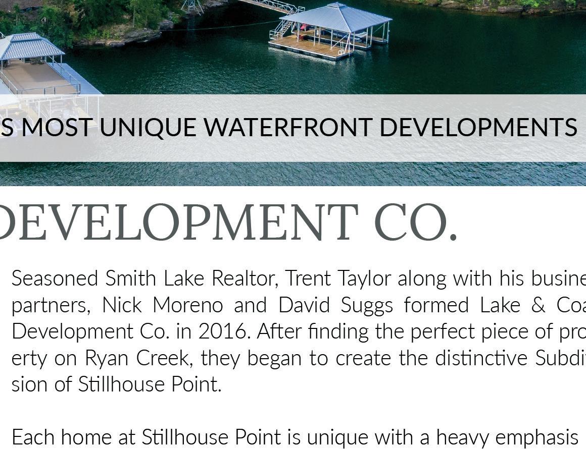 KT Signature Homes w SA................................................................ 59 Lake & Coast Real Estate Co. | Trent Taylor ................................. 48 Lake & Coast Development Co. | Trent Taylor 49 Lakeside Sports & Recreation | The Lakeside Life Store 104 Legacy Land Solutions ....................................................................... 87 MasterPro Audio | Marine/Home/Commercial Professional Audio/Video | Design/Build/Install ......................... 66 MasterPro Audio | SeaDek | HydroHoist | GoSurf Assist ........ 107 MasterPro Audio | Sonos | Design/Build/Install .......................... 41 MavenCross Wealth Advisors | Jeff Roberts ............................... IFC Musgrove Country Club .................................................................... 27 Mustard Seed Nursery 87 Nogginhed 71 Oh Snap Photography | David Bean................................................ 29 Pat’s Archery & Outdoors ................................................................. 81 RE/MAX Elite | Darren Raspino ........................................................ 1 Renasant Bank | Bryan Miller ........................................................... 31 Russell Marine | Smith Lake ............................................................. 67 Russell Marine | Smith Lake ............................................................. 79 Scott Eric Day Photography and Videography | Scott Eric Day 95 Seibels Cottage 45 Sharky’s Mobile Detailing .................................................................. 63 Smith Lake Flea Market & Vintage Mall ........................................ 85 Smith Lake Rentals and Sales ........................................................... 43 Smith Lake RV & Cabin Resort ........................................................ 22 Southern Accents Architectural Antiques ..................................... 59 Ms. Smirks Boutique & Gifts ............................................................ 85 Target Pest Control 104 The Lakeside LIfe | Everyone has a Story 107 The Lakeside Life | BEST OF SMITH LAKE................................. 17 Tow Boats US | Smith Lake ............................................................... 69 Townhouse Galleries .......................................................................... 33 TRI-AD Docks, LLC ........................................................................... 97 Valley Heating & Cooling .................................................................... 4 Vincent Furniture ................................................................................ 41 Vintage West Interiors ....................................................................... 29 Werner’s Trading Company 81 White Willow 39 Whitlock’s General Store and Café.................................................. 97