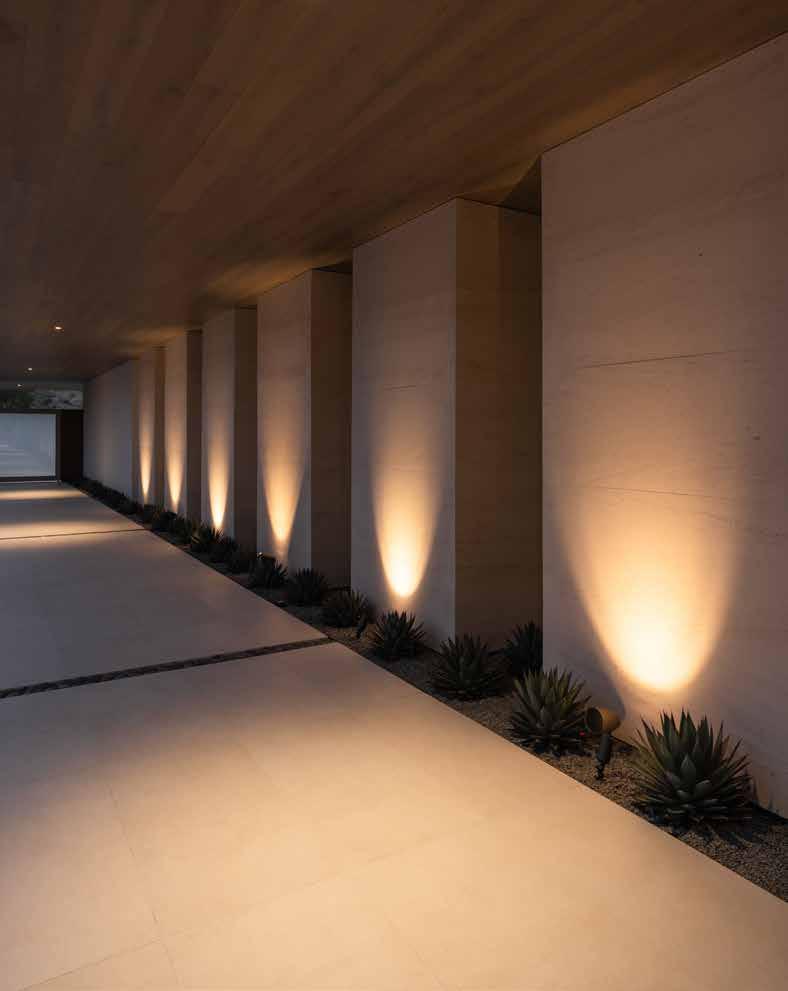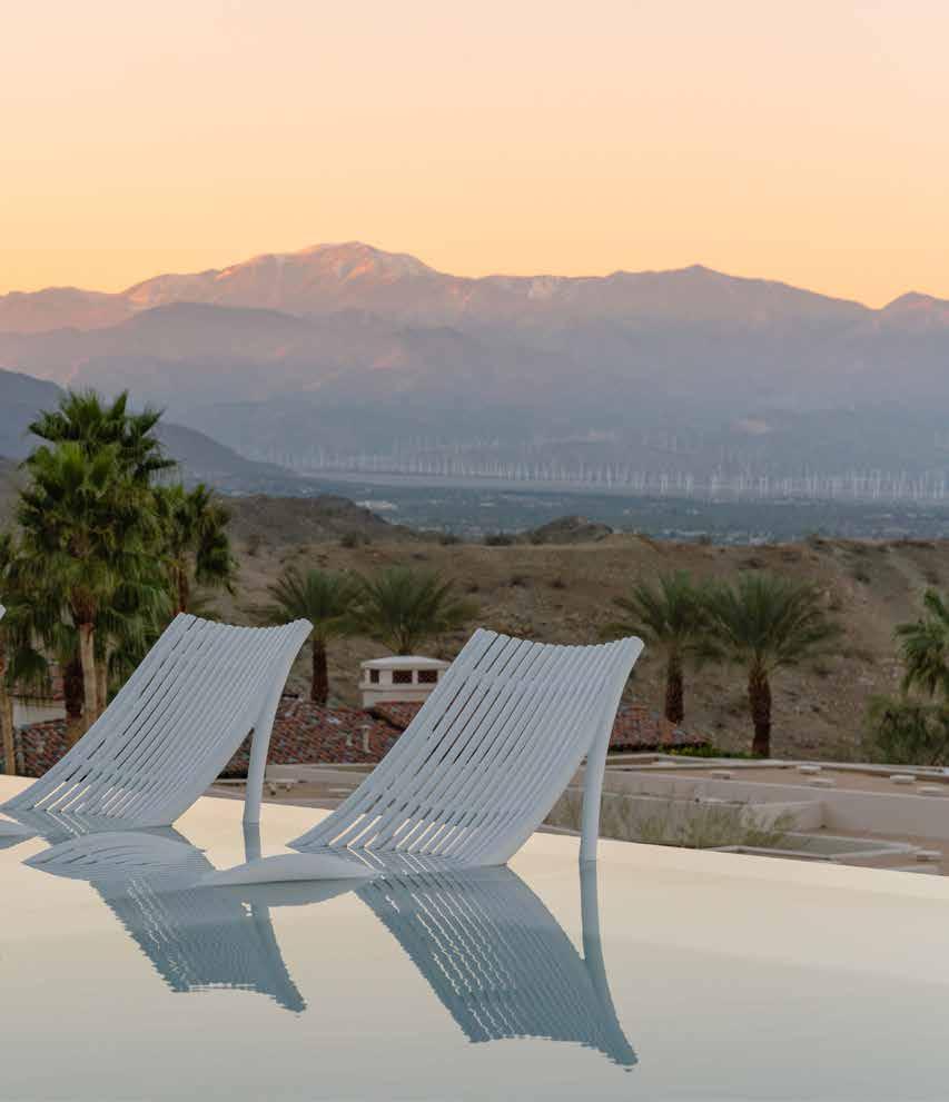 In the primary bedroom, a custom 18-foot dual-height layered leather headboard, topped in a Christopher Jeffries sculpture made up of white glass discs, hand-placed by the artist. And on the veranda, a geometric black metal commission by Palm Springs-area artist Ryan Campbell smooths the indooroutdoor transition. Abitare also custom designed cocktail tables throughout, as well as a king-sized outdoor daybed, to fulfill a homeowner request for an outdoor napping spot.