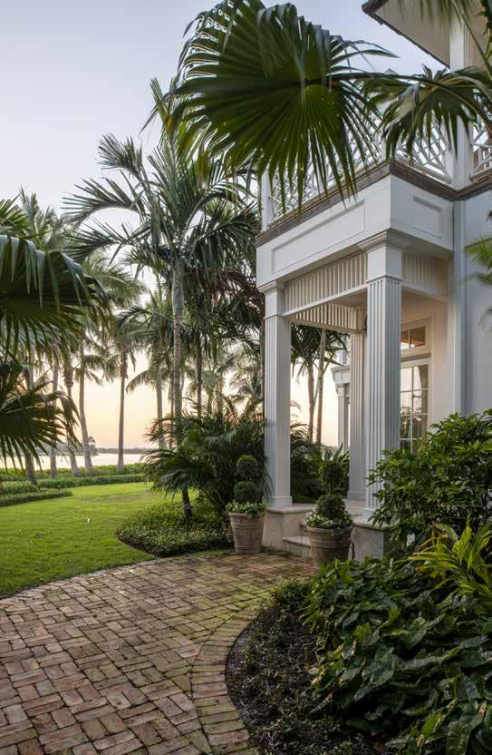 Over the next two years, Rehkamp Larson and her client refined the home with a local custom builder. They had collaborated with Minneapolis cabinetmaker Jon Frost on the Bay Lake cabin and the Minneapolis condo, so they invited him to lend his talents to the extensive two-year renovation. They created a sense of arrival with a graceful curving brick driveway, added elegant millwork, trim and window muntins throughout the interiors and redesigned the two wings. The south wing accommodates a luxurious primary suite, a library and guest suite, while the north wing features a spacious kitchen, a coffee pantry, a butler pantry and a kitchen pantry, as well as a mudroom, a powder room, a cozy den and a trio of guest suites. When the renovation was finished, the client worked with a local landscape team to create lush gardens with native plants and palm trees that appear to have always been part of the scenery.
