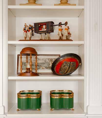 Situated at 50th and France across from Salut in Edina, the Noble Signature Design studio is equally well-dressed in gracious, Charleston-meets-Park Avenue style. The lacquered green walls are layered with mirrors, oil paintings and Chinoiserie engravings, while an 18thcentury English dresser converses with a round antique dining table and a tailored blue sofa upholstered in the same hue as the classic blue and white porcelain cachepots on the painted bookshelves.