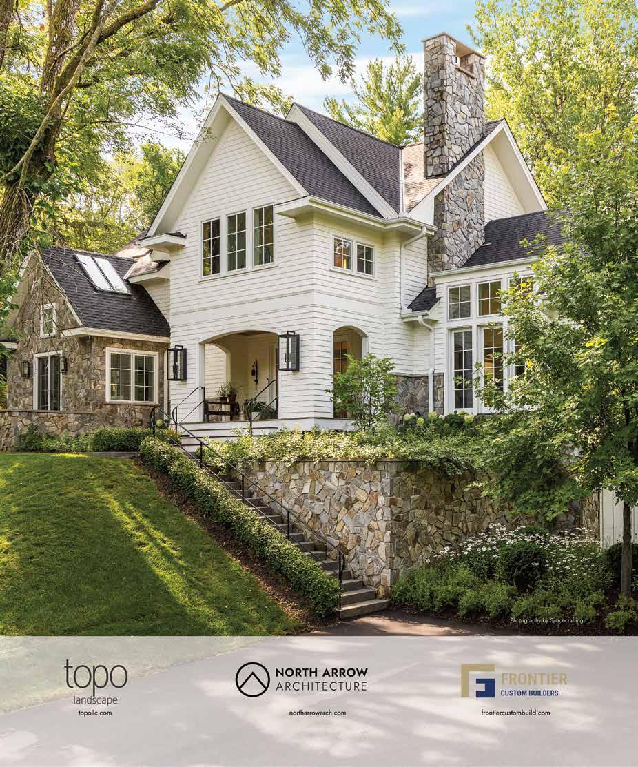 Designing and building a new custom home takes a village, so Anderson and Le Moine worked handin-hand with the client, Costello and colleagues Mike Shideman and Ryan Szafranski, interior designer Julia Miller and landscape architect Jonathan Blaseg to create a light-filled modern lake home with curated gardens and a historic garage with a patio for chatting with neighbors over a glass of wine. “The client is very creative and design savvy, so he was wonderful to work with,” says Anderson. “We all shared his desire to be a good steward of Excelsior and respect the city’s Good Neighbor design guidelines, so he trusted us to create a home that would be welcomed with open arms by the community.”