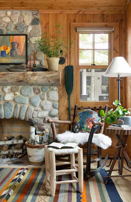 Wiggie required a brand new foundation, which gave Whicher the creative freedom to add a hot cocoa bar, a screen porch and a deck overlooking the lake. Kinnunen rebuilt every inch of the cottage, including the stone fireplace, which he reconstructed with the original rocks. To give Wiggie a true Northwoods spirit of place, Whicher and Penfield drove into Cable and went shopping at Rondeau’s, the local hardware store, where they bought mugs for hot cocoa, hooks for swimsuits, lanterns for nighttime walks and other thoughtful details to make the cottage feel like camp.