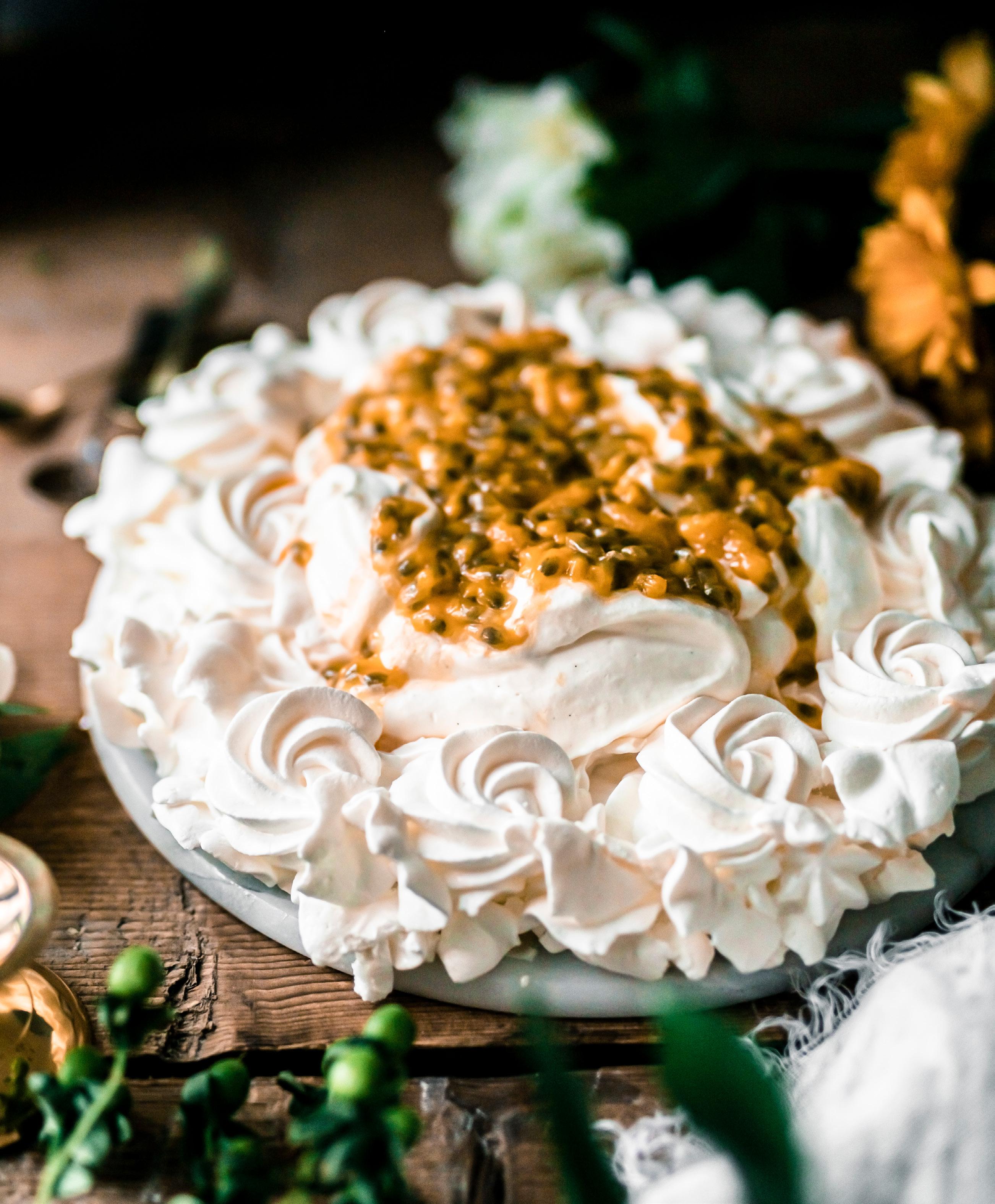 Išplakite grietinėlę su šaukštu cukraus. Paskirstykite ją ant morengo paviršiaus ir papuoškite išskobtomis pasifloromis. Skanaus!