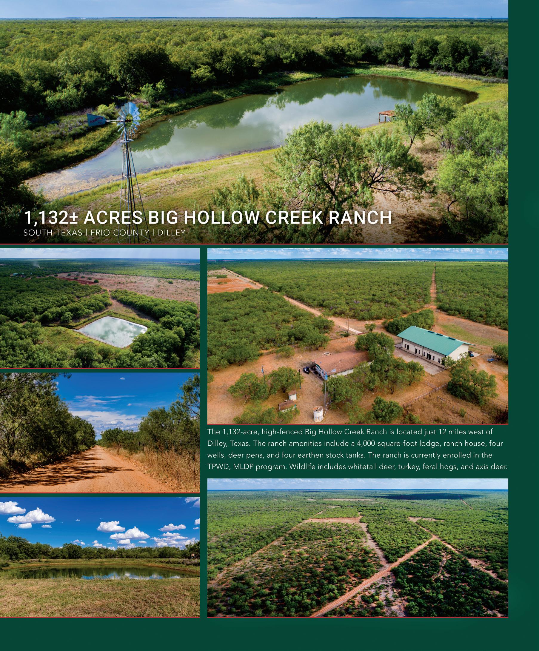 Located eight± miles southwest of Carrizo Springs, Texas, in the heart of the Golden Triangle. Boasting gently rolling terrain, good native brush diversity, and a history of extensive land management, this ranch offers a well-balanced variety of habitats for wildlife. Caponus Ranch is well watered, with one irrigation well feeding a 23-acre high-fenced pivot (approximately 800-1,000 GPM). There are four solar wells in different locations on the ranch and 21± surface tanks placed throughout the ranch. The Caponus Ranch hunting pastures offer abundant hunting opportunities for white-tailed deer, dove, quail, and Rio Grande Turkey.