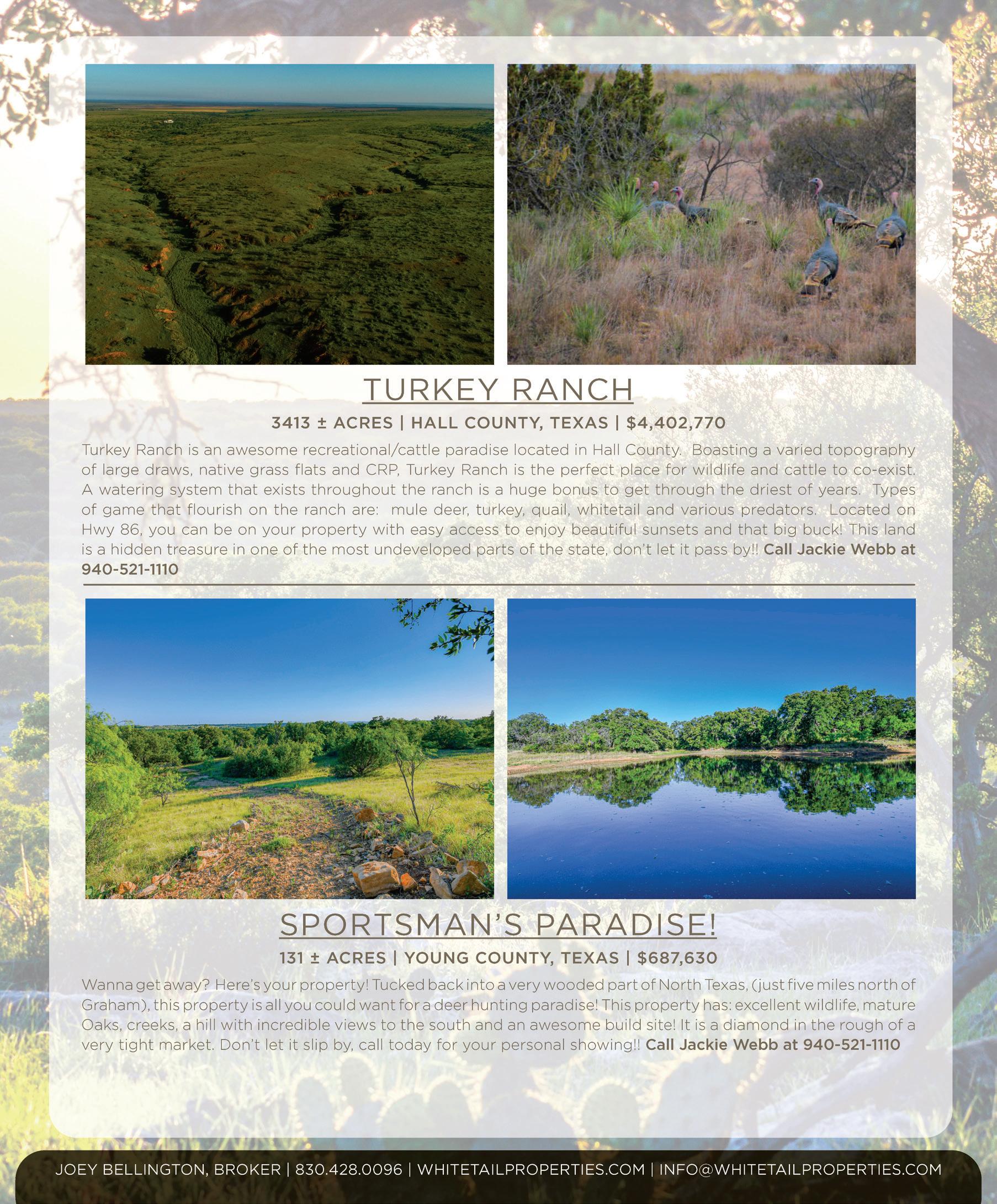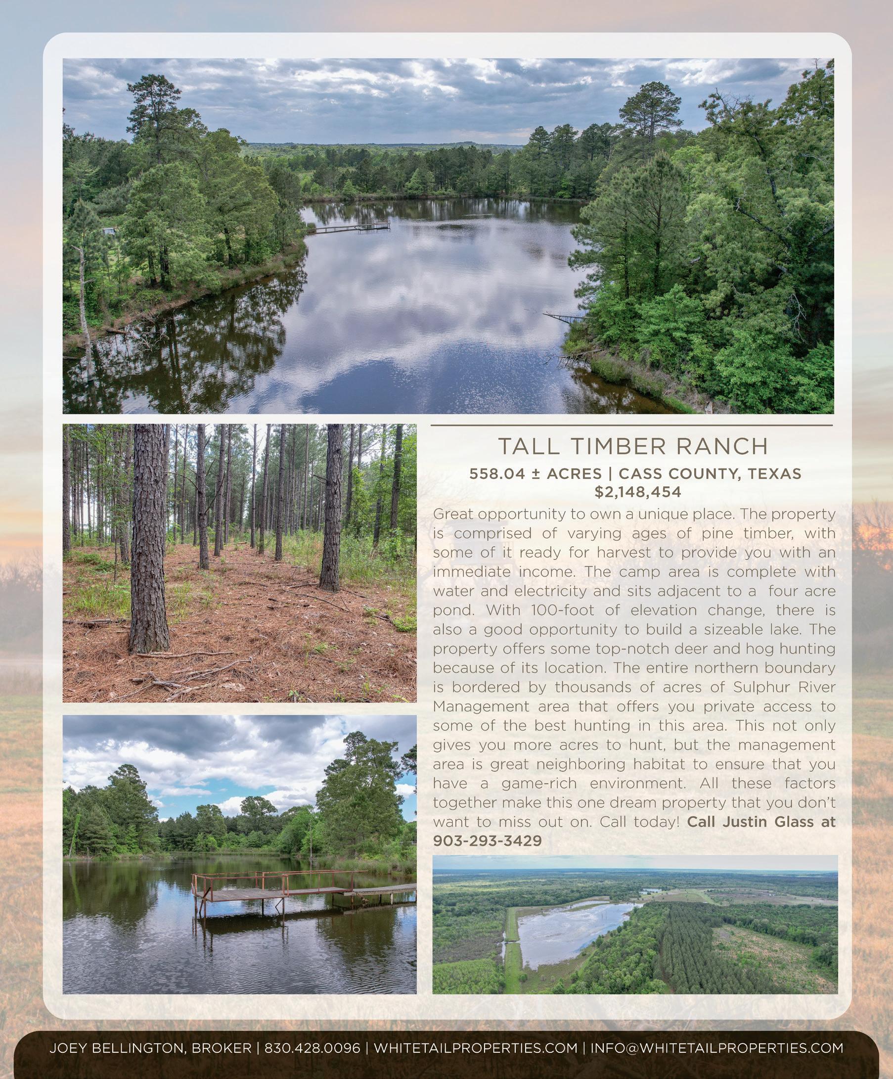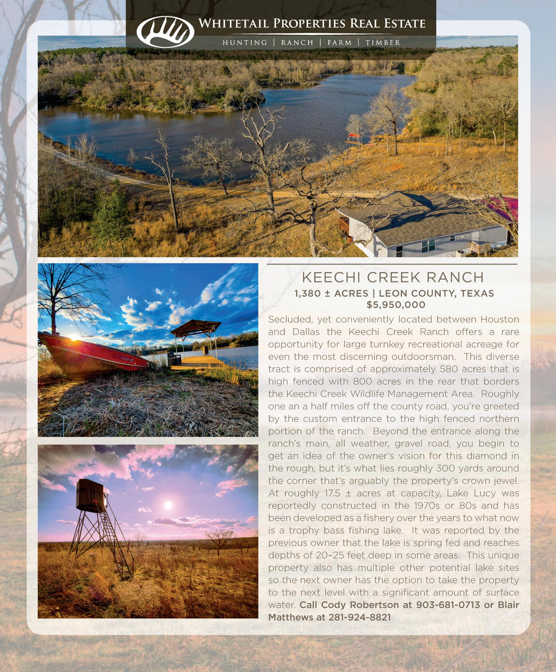 The High Tine Ranch checks all the boxes for a premier hunting and recreation ranch. Convenient location with paved-road access, large low-fenced neighbors, and ample herds of exotic and native animals, all on a rolling terrain, gentle enough for everyone to enjoy the entire ranch. Some of the most abundant herds of Axis deer and Whitetail are found roaming this ranch and the surrounding area. Sensible deed restrictions allow owner and seller to have confidence in their property’s enjoyment and future value. Caleb Rightmer, Agent.