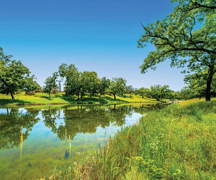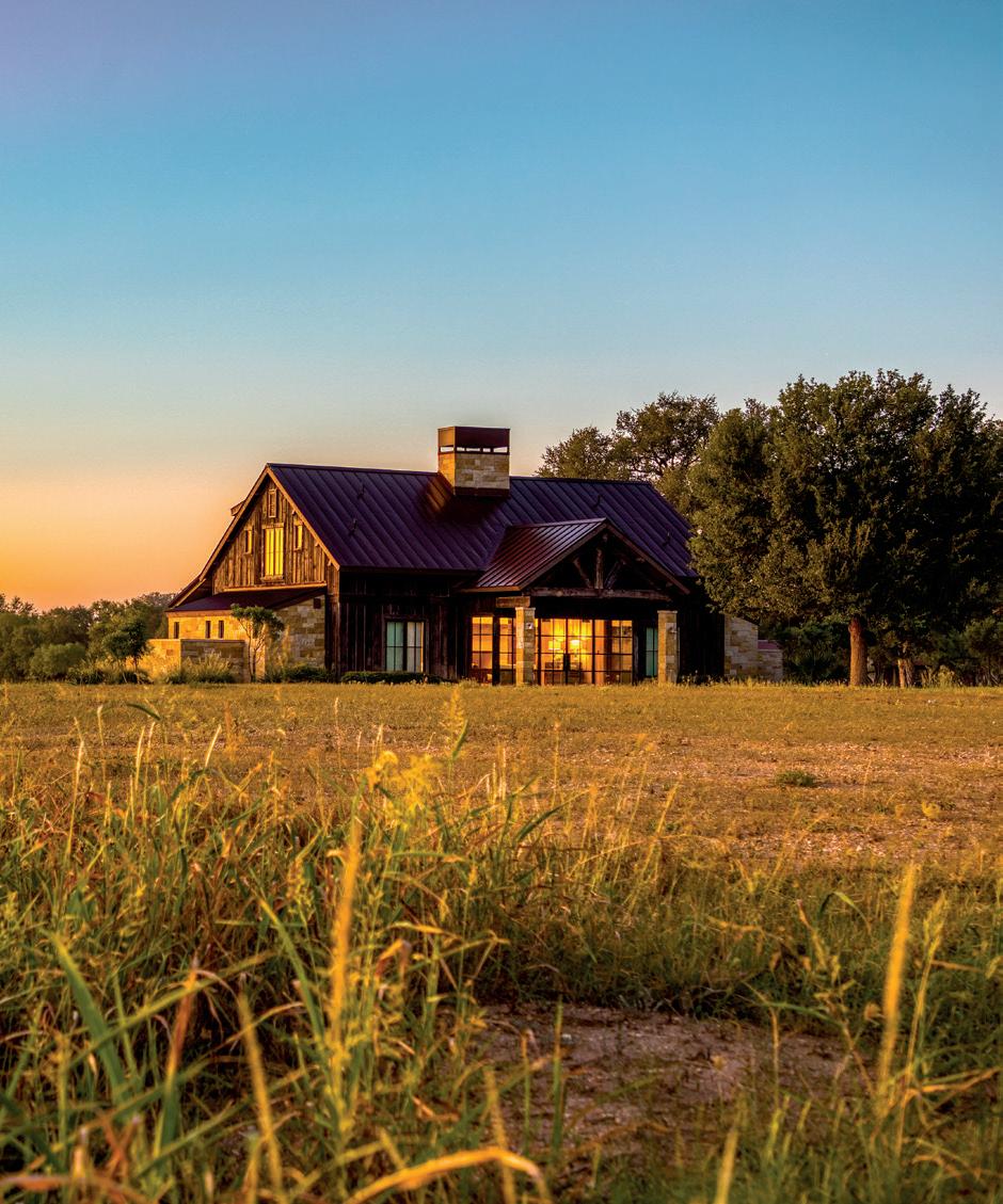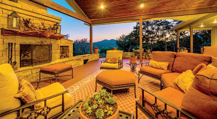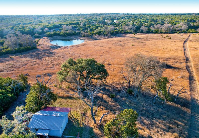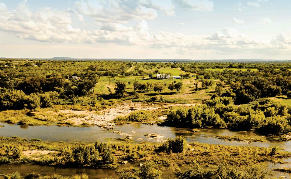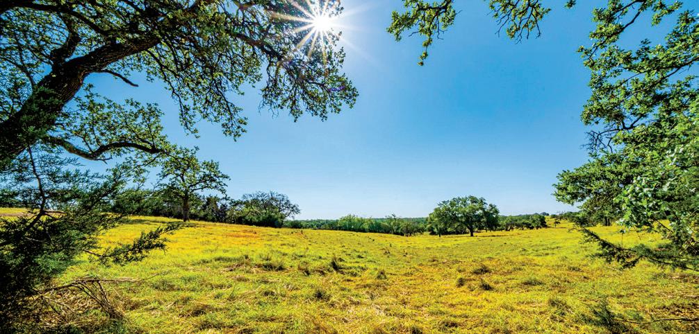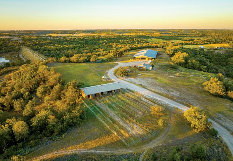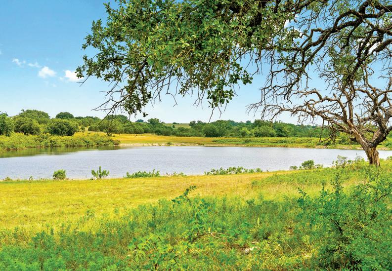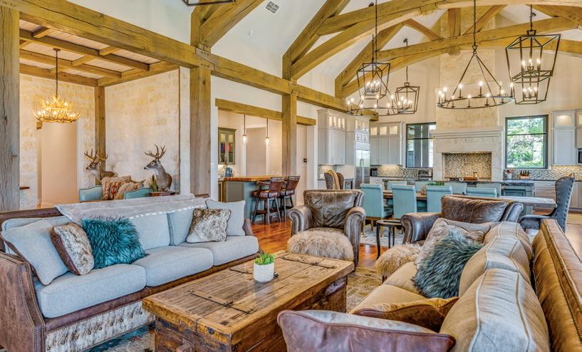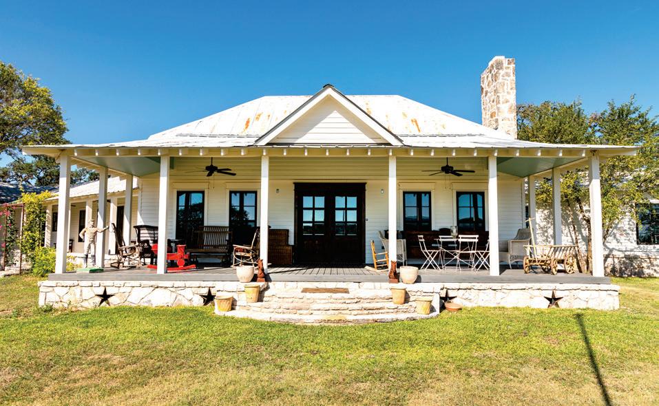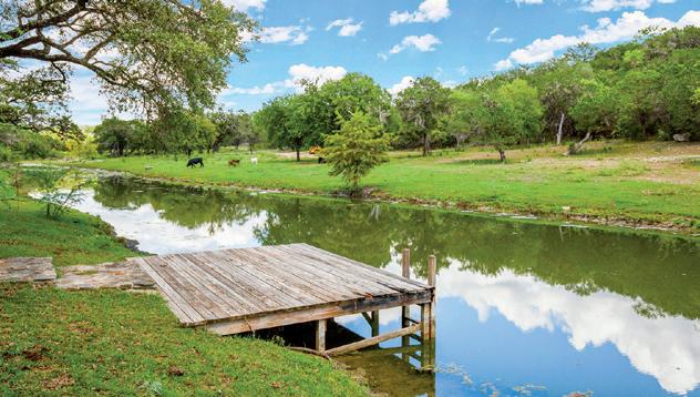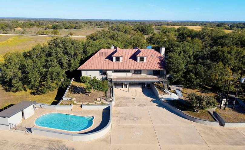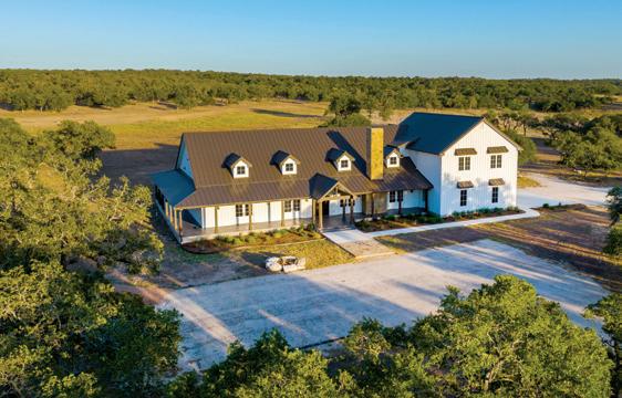 COMFORT, TEXAS Close proximity to Kerrville, Fredericksburg, and Boerne. This 191-acre ranch features three ponds, beautiful hills, and nice fields. Perched on top of a hill, with views for miles, is a stunning modern farmhouse-style home surrounded by fifteenfoot porches. You will find gorgeous stone walls, vaulted ceilings with white oak wood beams, hand-made custom lighting from Mexico, and wide plank mesquite wood floors as you enter the home. There is a fabulous chef’s kitchen featuring a Wolf range with double ovens, a pot filler, a vent hood set in stone, two Sub-Zero refrigerators, freezers, four refrigerator drawers, custom-built cabinets by Michael Edwards, a large island with a granite top, and a farmhouse sink. The kitchen is open to the dining room, wet bar, and living room with an amazing fireplace and hill country views through the accordion-style glass and metal frame doors. The bar boasts a gorgeous mesquite wood counter with a beverage refrigerator and ice maker. The spacious master wing is host to a wonderful office, a large bedroom with a sitting area, a spa-like bath with travertine floors, a walk-in shower, a soaking tub, beautiful vaulted ceilings, a coffee bar, and a closet with custom builtins. The guest wing features two bedrooms with spacious baths and a game room. Outside you will find a four-car garage with a lift to floored climate-controlled storage. This is the perfect property for the most discriminating buyer.