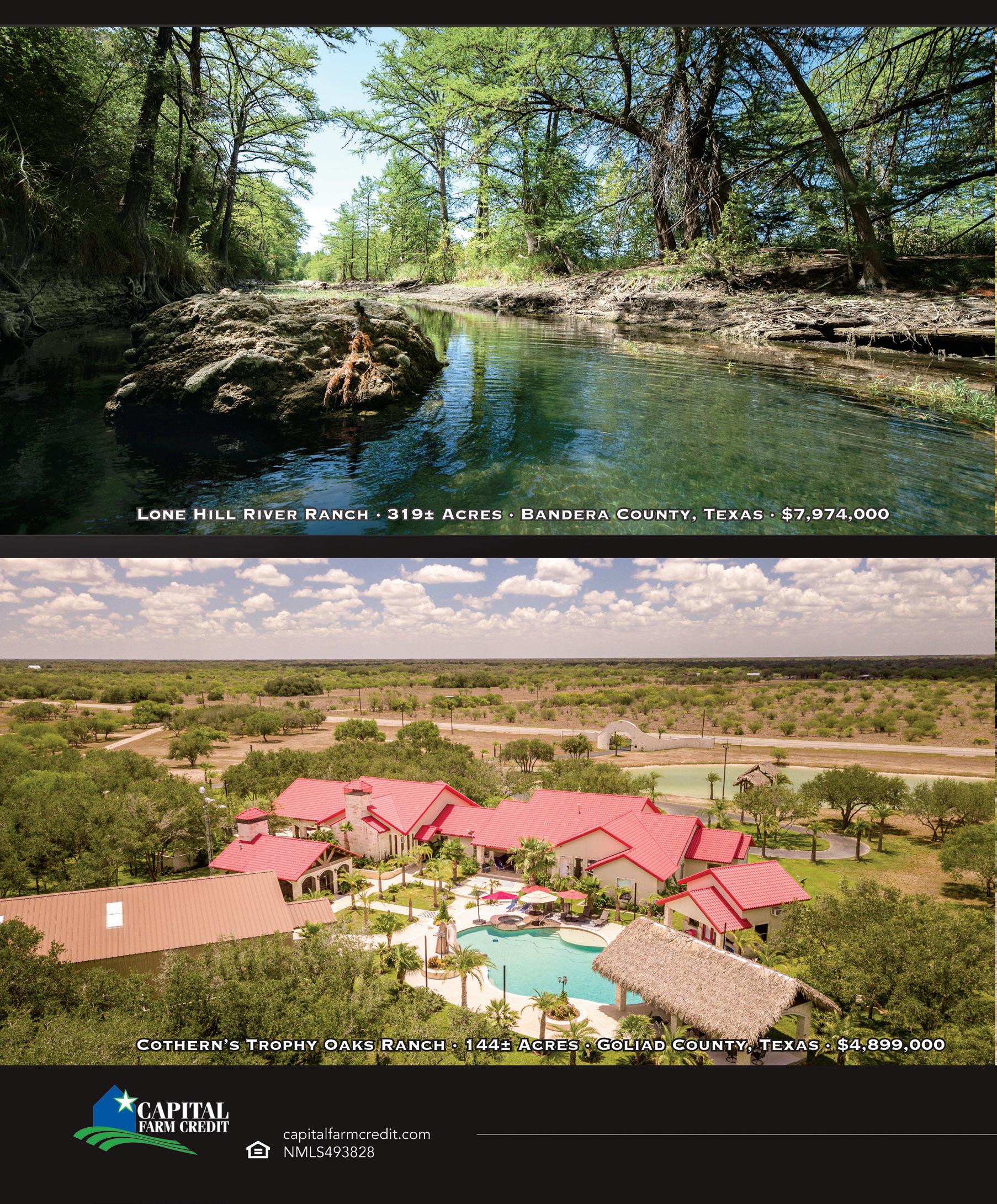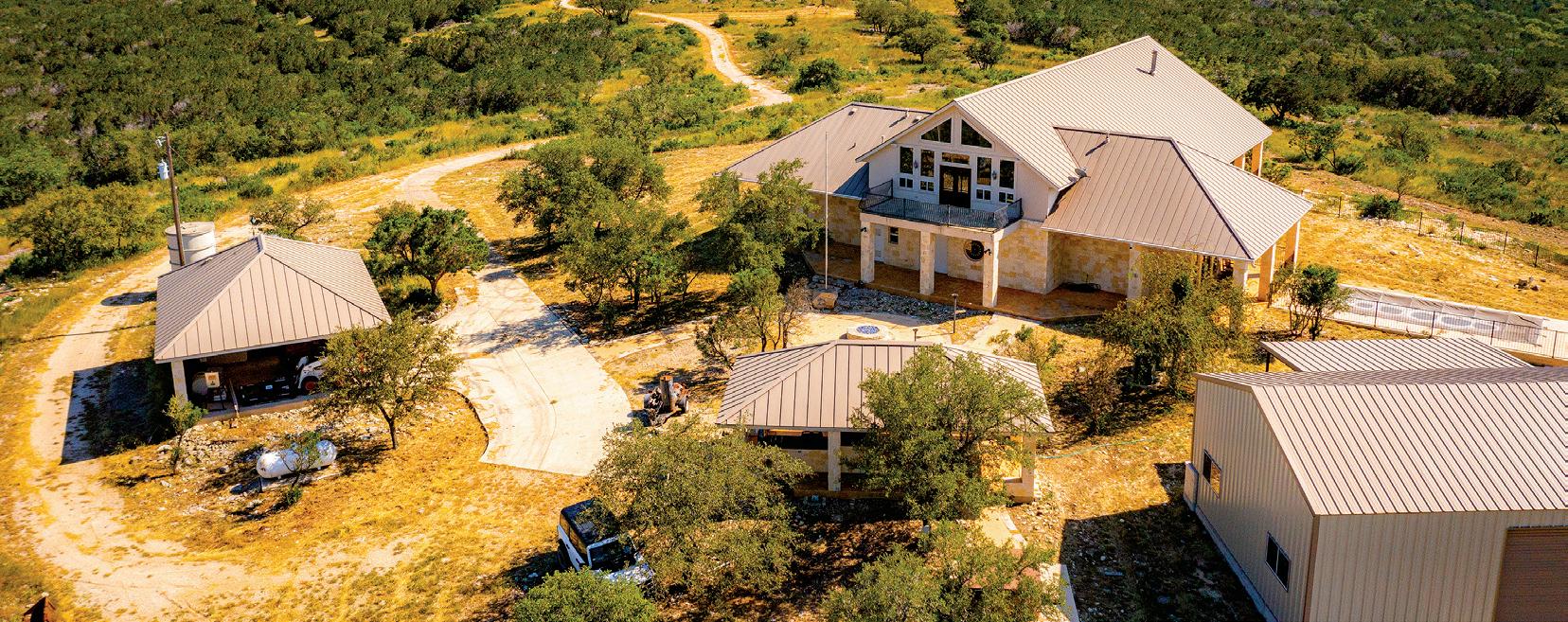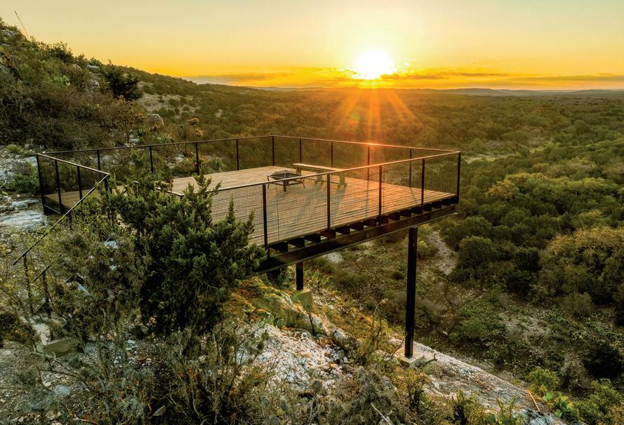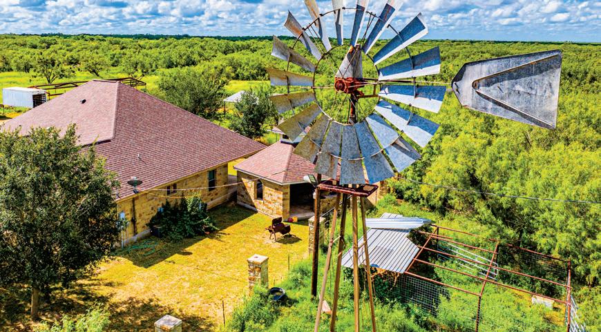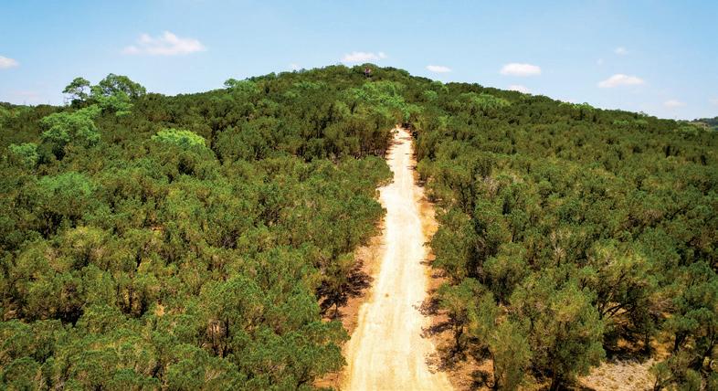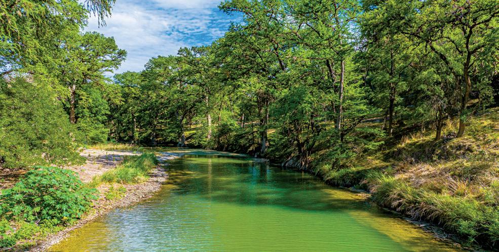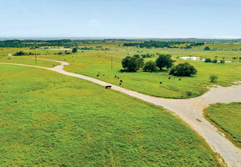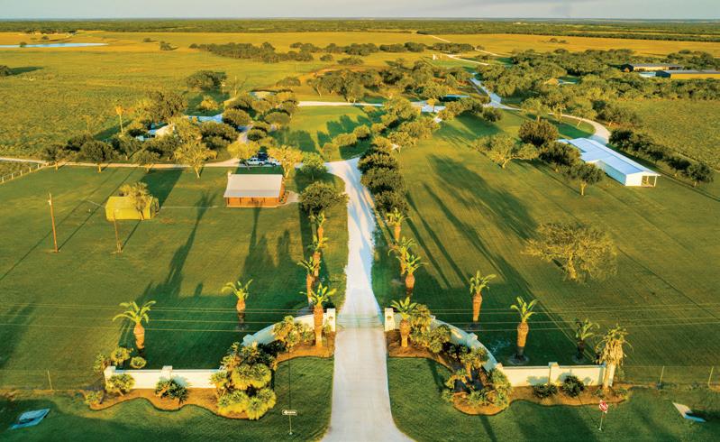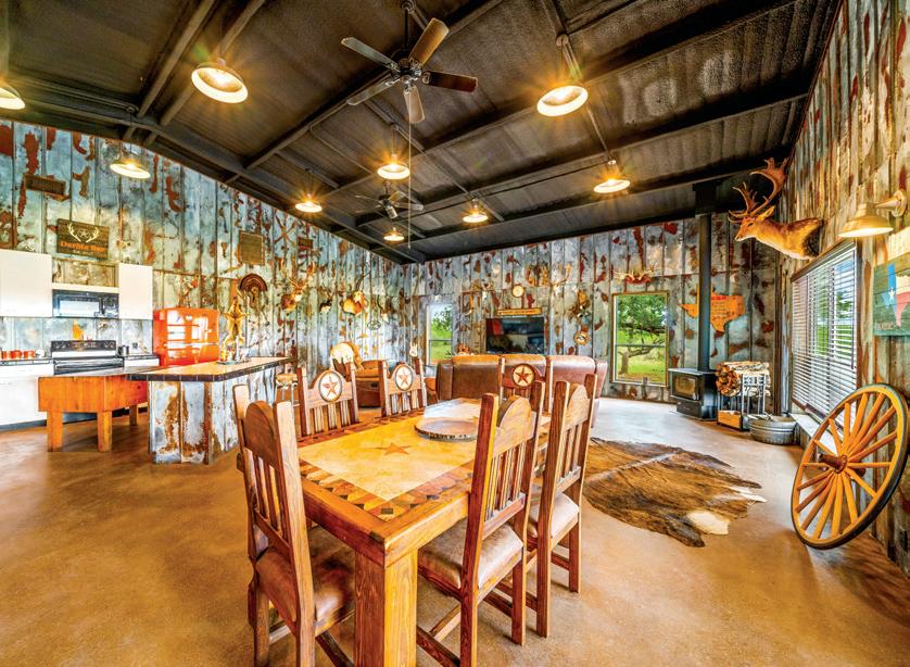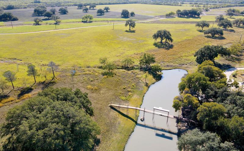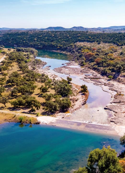 COMFORT, TEXAS Close proximity to Kerrville, Fredericksburg, and Boerne. This 191-acre ranch features three ponds, beautiful hills, and nice fields. Perched on top of a hill, with views for miles, is a stunning modern farmhouse-style home surrounded by fifteenfoot porches. You will find gorgeous stone walls, vaulted ceilings with white oak wood beams, hand-made custom lighting from Mexico, and wide plank mesquite wood floors as you enter the home. There is a fabulous chef’s kitchen featuring a Wolf range with double ovens, a pot filler, a vent hood set in stone, two Sub-Zero refrigerators, freezers, four refrigerator drawers, custom-built cabinets by Michael Edwards, a large island with a granite top, and a farmhouse sink. The kitchen is open to the dining room, wet bar, and living room with an amazing fireplace and hill country views through the accordion-style glass and metal frame doors. The bar boasts a gorgeous mesquite wood counter with a beverage refrigerator and ice maker. The spacious master wing is host to a wonderful office, a large bedroom with a sitting area, a spa-like bath with travertine floors, a walk-in shower, a soaking tub, beautiful vaulted ceilings, a coffee bar, and a closet with custom builtins. The guest wing features two bedrooms with spacious baths and a game room. Outside you will find a four-car garage with a lift to floored climate-controlled storage. This is the perfect property for the most discriminating buyer.