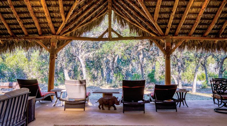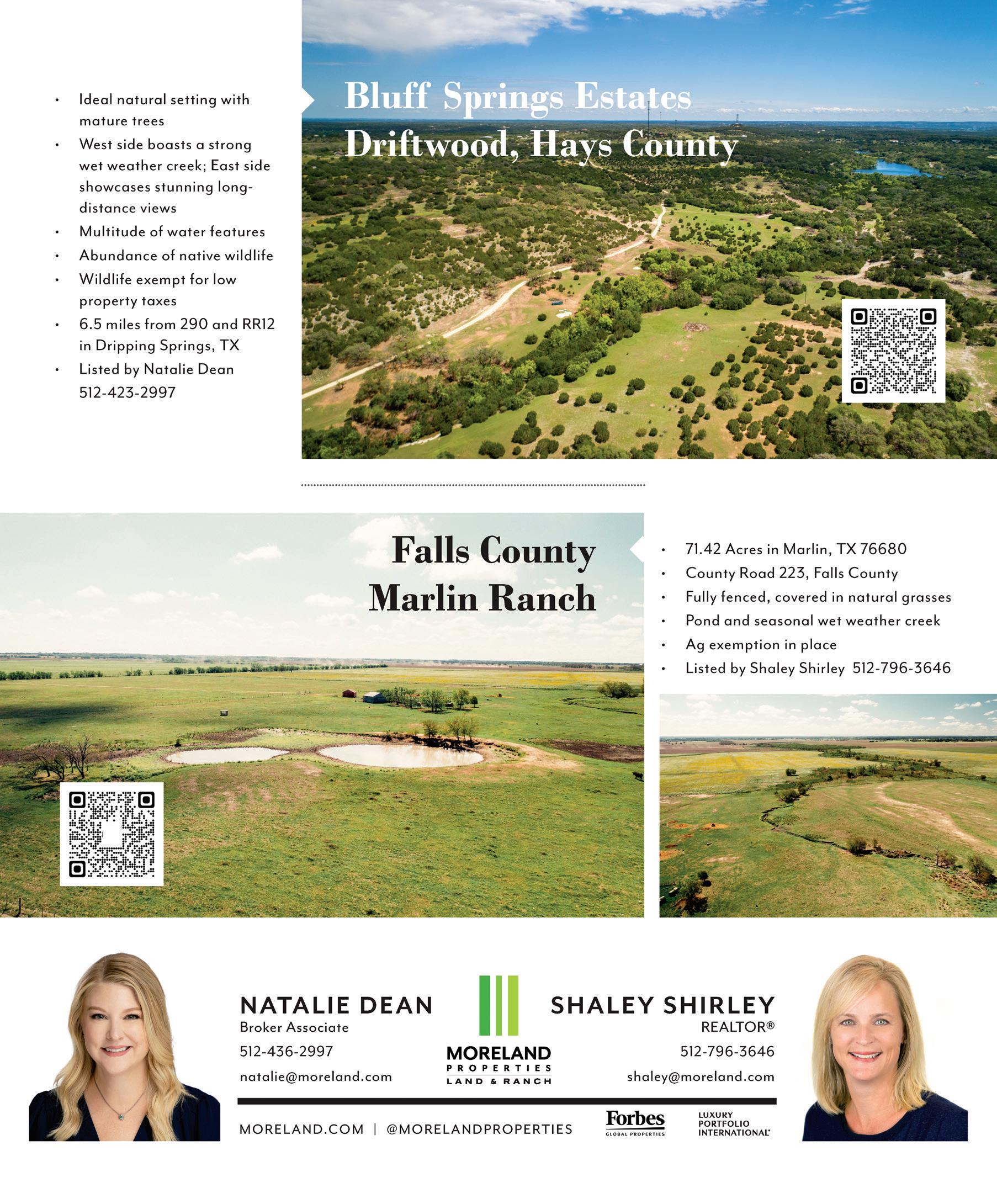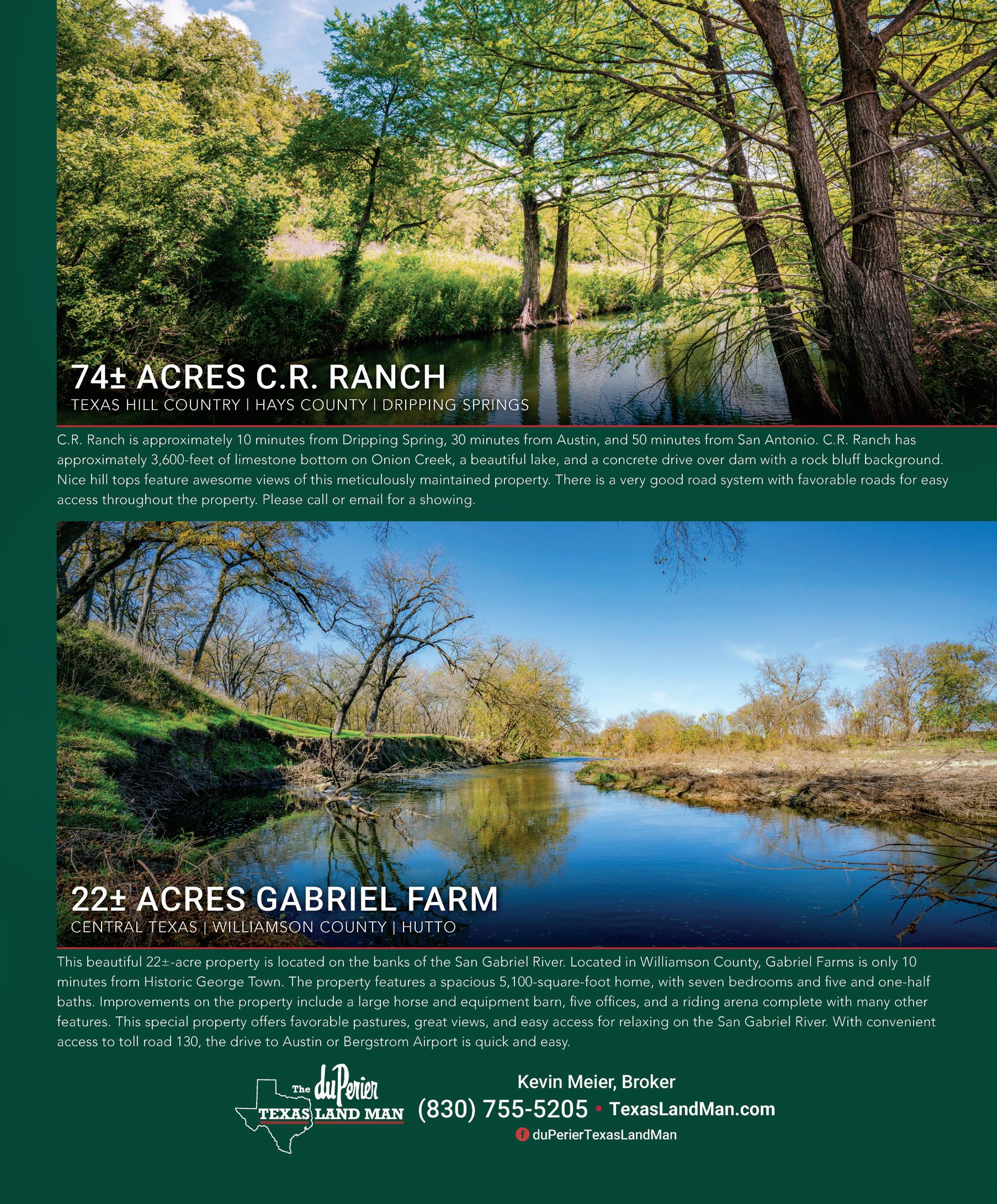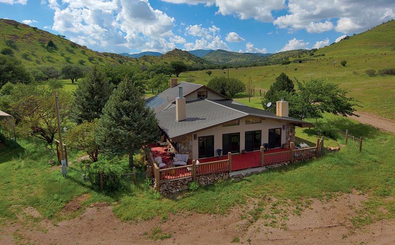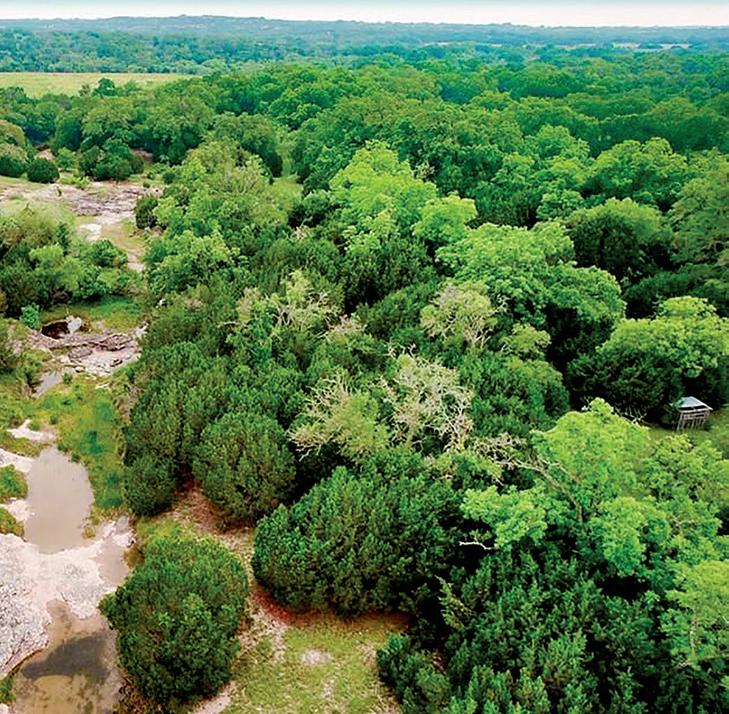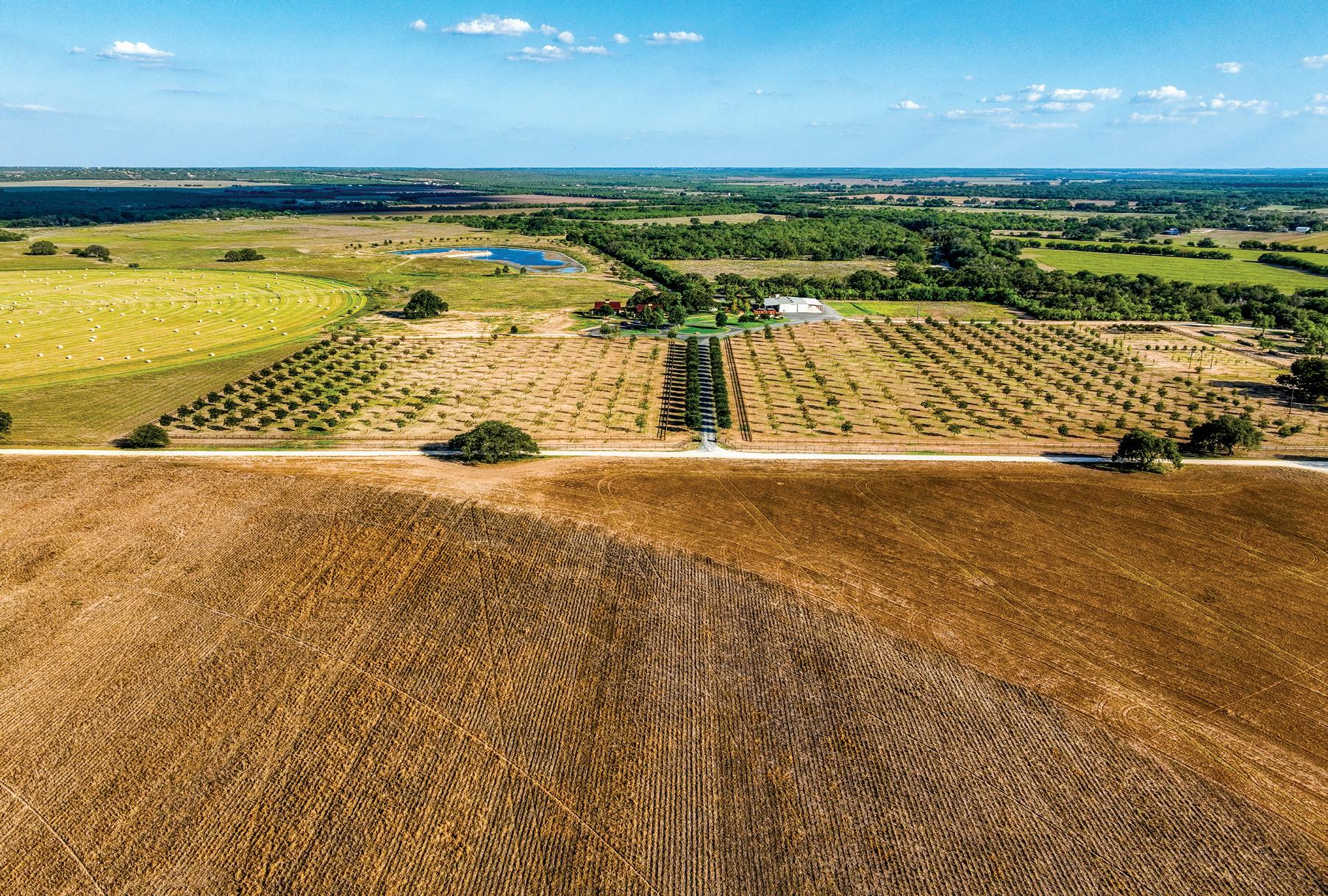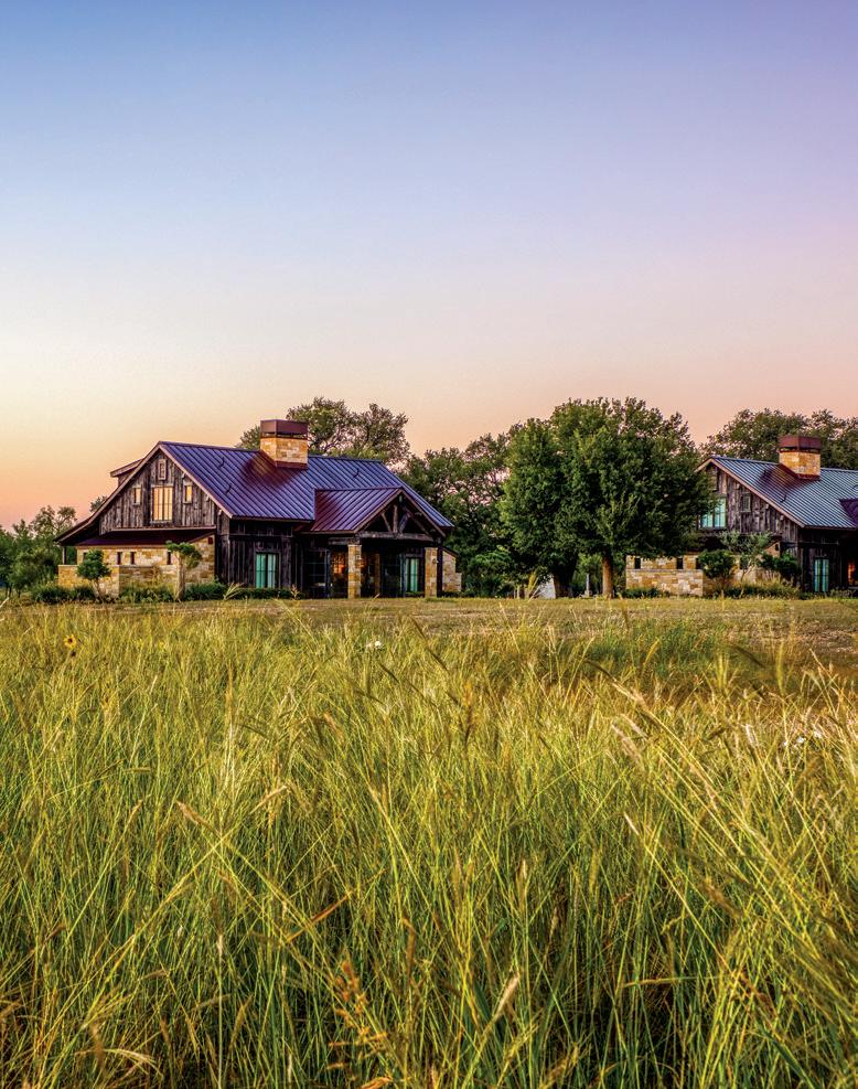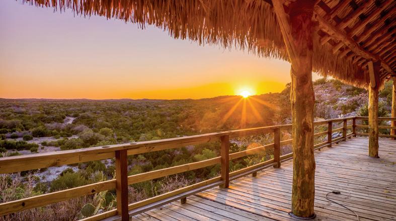 COMFORT, TEXAS Close proximity to Kerrville, Fredericksburg, and Boerne. This 191-acre ranch features three ponds, beautiful hills, and nice fields. Perched on top of a hill, with views for miles, is a stunning modern farmhouse-style home surrounded by fifteenfoot porches. You will find gorgeous stone walls, vaulted ceilings with white oak wood beams, hand-made custom lighting from Mexico, and wide plank mesquite wood floors as you enter the home. There is a fabulous chef’s kitchen featuring a Wolf range with double ovens, a pot filler, a vent hood set in stone, two Sub-Zero refrigerators, freezers, four refrigerator drawers, custom-built cabinets by Michael Edwards, a large island with a granite top, and a farmhouse sink. The kitchen is open to the dining room, wet bar, and living room with an amazing fireplace and hill country views through the accordion-style glass and metal frame doors. The bar boasts a gorgeous mesquite wood counter with a beverage refrigerator and ice maker. The spacious master wing is host to a wonderful office, a large bedroom with a sitting area, a spa-like bath with travertine floors, a walk-in shower, a soaking tub, beautiful vaulted ceilings, a coffee bar, and a closet with custom builtins. The guest wing features two bedrooms with spacious baths and a game room. Outside you will find a four-car garage with a lift to floored climate-controlled storage. This is the perfect property for the most discriminating buyer.