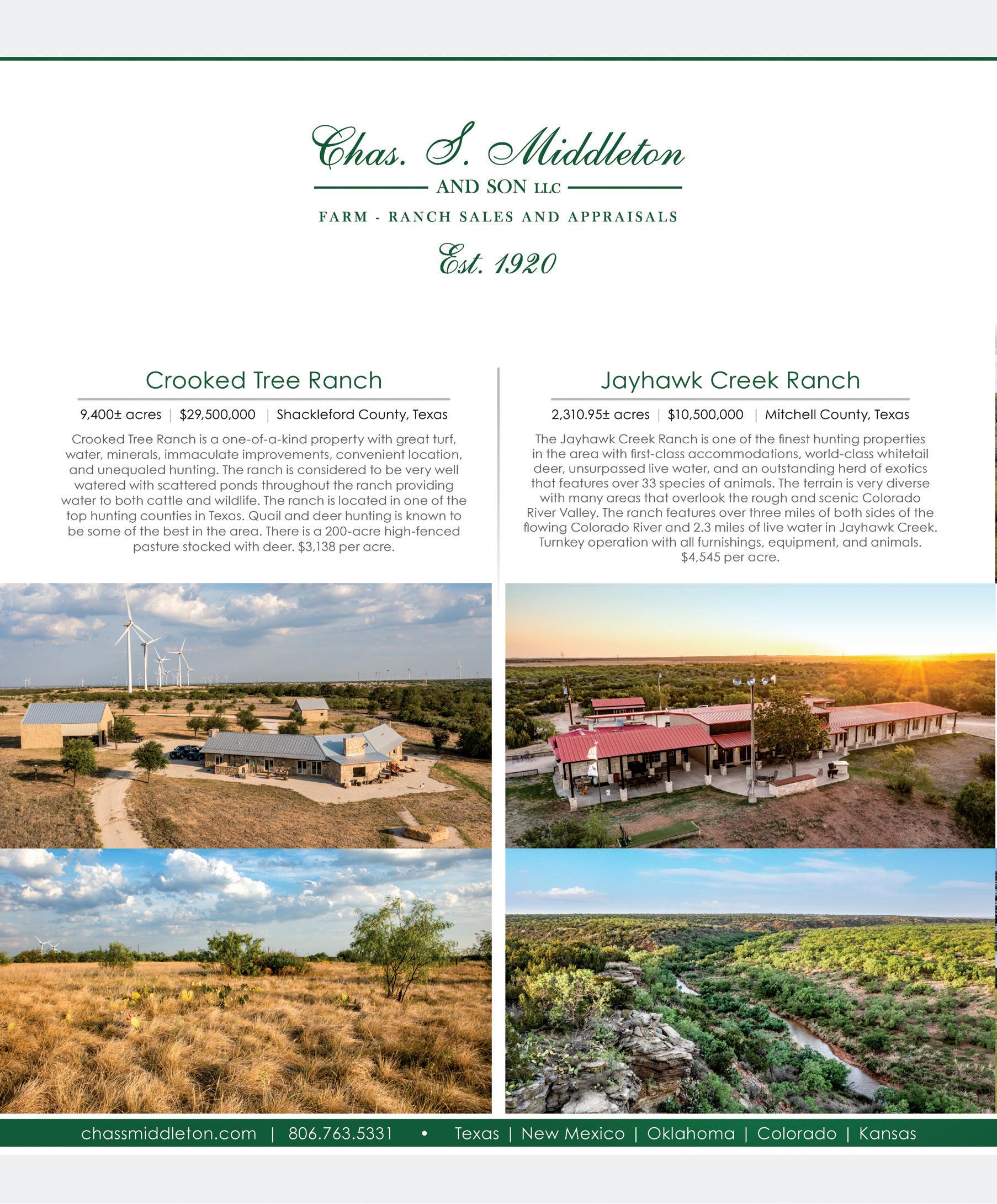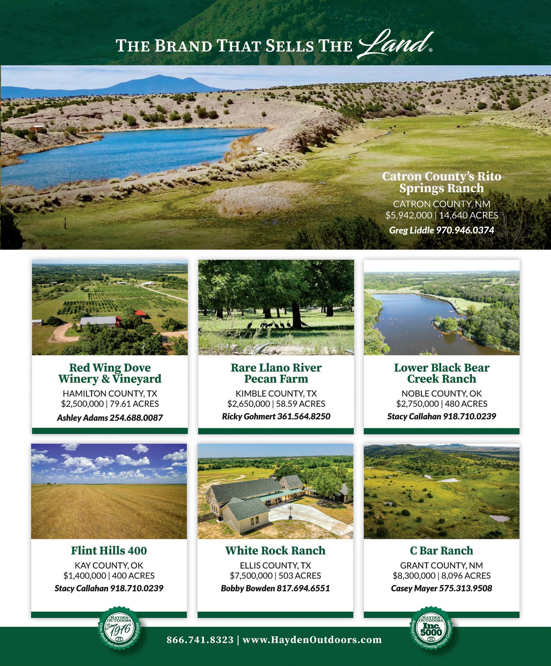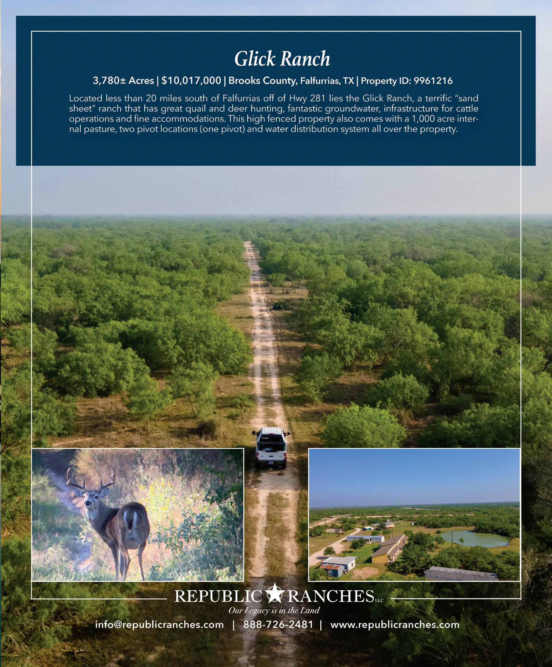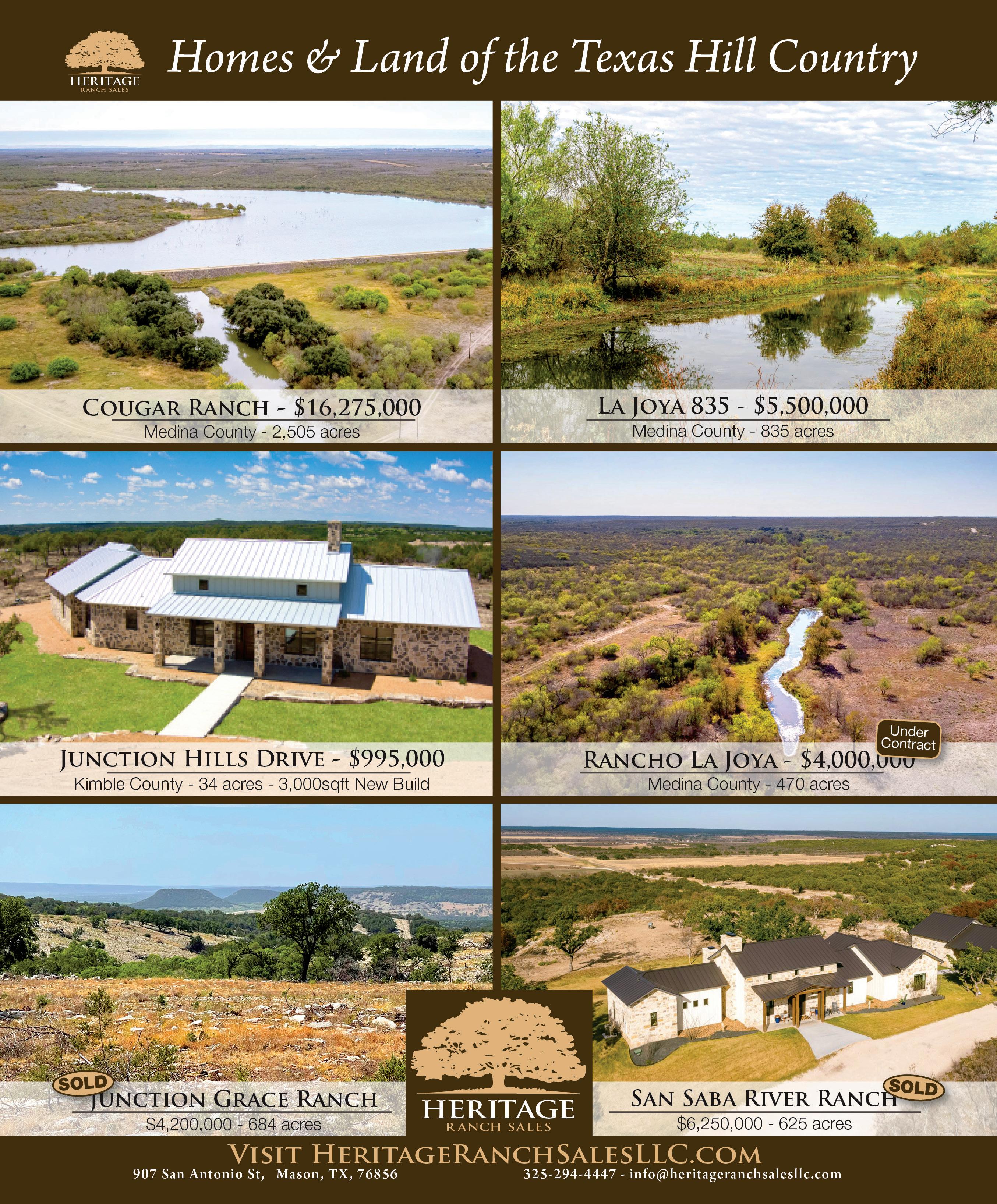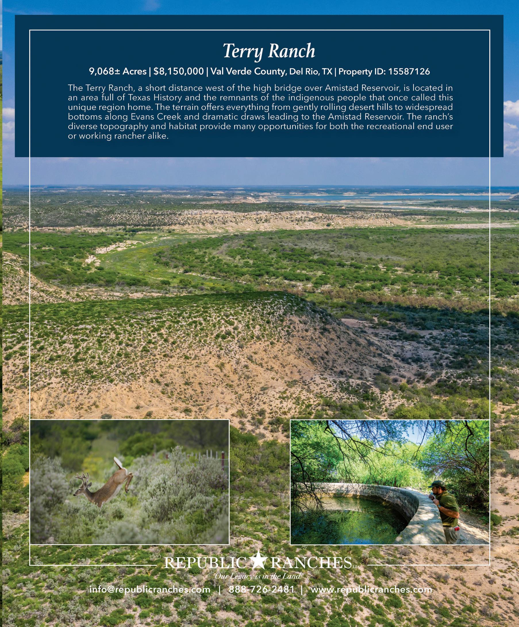 Eleven miles southwest of Bracketville, the vibrant 2,963-acre Cow Creek Ranch is the perfect combination of native brush and agriculturally productive irrigated farmland. This high-fenced ranch will serve the needs of both the sportsman and Ag producer. The property conveys 2,940 acre-feet of permitted water rights. $7,407,500