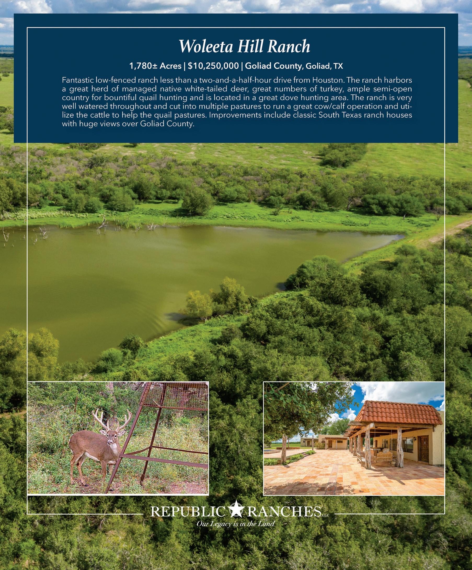 This majestic ranch spans nearly 10,000 acres of land, offering the best in south Texas wing shooting and trophy Whitetails and exotics. Its rich, fertile sandy loam soils, numerous water sources, and some strategically placed quail strips create that perfect habitat for any quail aficionados while supporting vast numbers of wildlife and cattle. Located near McAllen/Edinburg, in the center of the Rio Grande Valley of Texas, the Arrowhead Ranch has hosted many foreign and domestic dignitaries over the years. $26,895,000 9,780± ACRES IN HIDALGO COUNTY • PROPERTY ID: 14536420