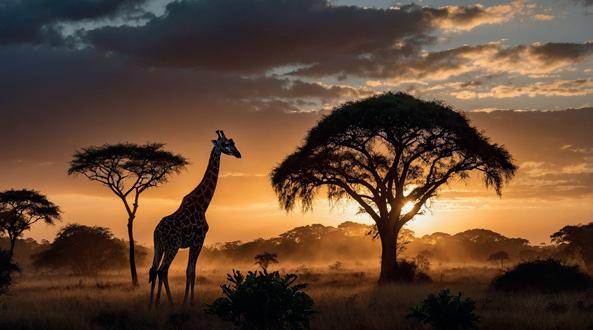 As our vehicle rounded a bend beneath the star-streaked sky, the headlights caught the elegant silhouette of a giraffe standing motionless against the backdrop of acacia trees. Bathed in a soft, golden glow, its long neck stretched high into the night, as if reaching for the moon. It turned slowly to look at us, eyes wide and shimmering, reflecting the quiet curiosity of a creature both gentle and majestic. There was something surreal about seeing such a towering animal in the darkness – its presence so calm and dreamlike.