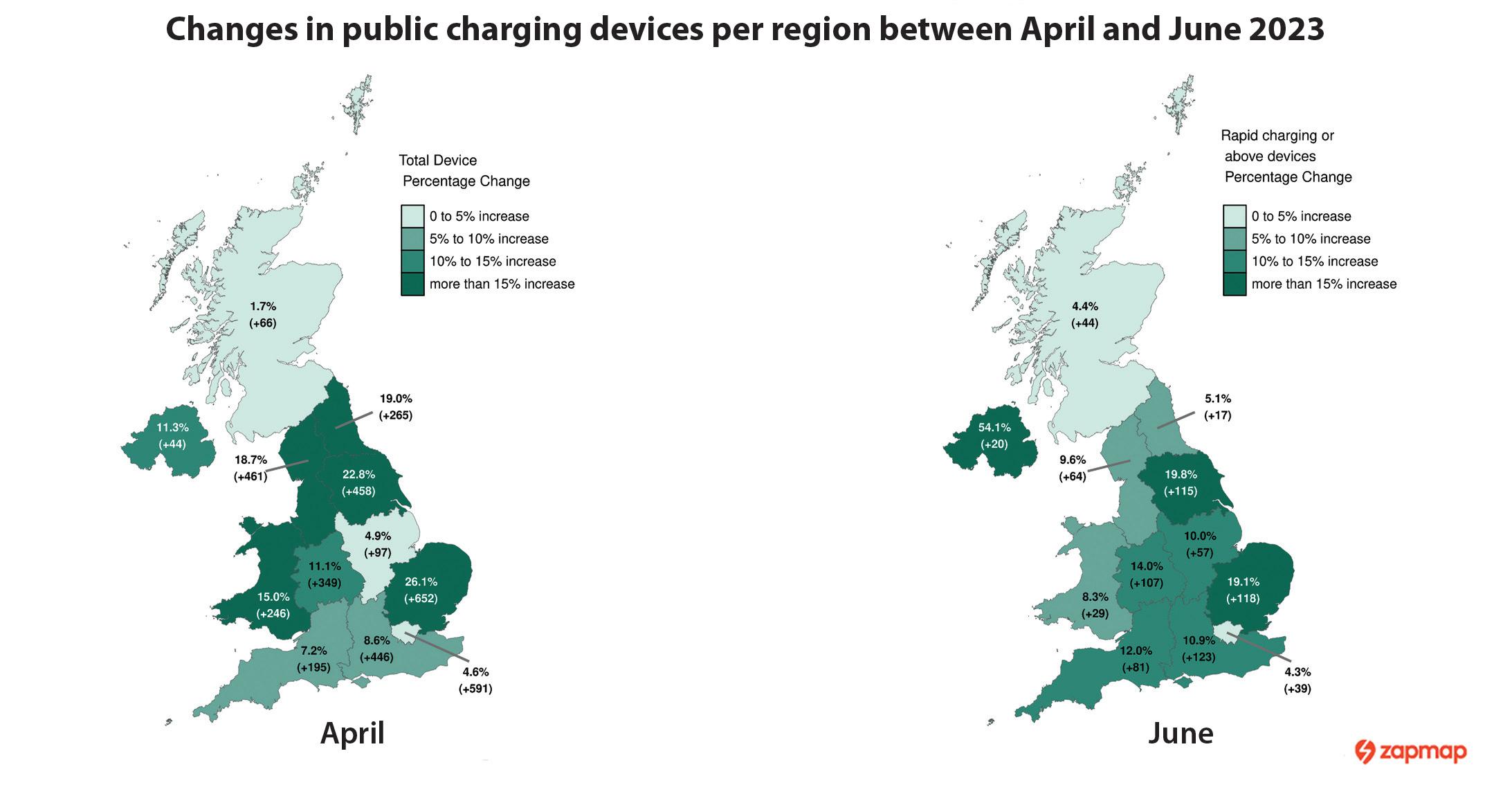 All regions across the UK saw an increase in total charging devices between April to June 2023. East of England had the greatest increase at 26.1%, whilst Scotland had the smallest increase at 1.7%. East of England had the greatest increase in absolute number of devices at 652 devices, followed by London at 591.
