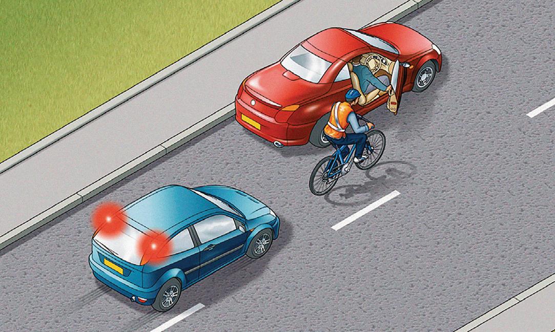 The code recommends a new technique when leaving vehicles. It is sometimes called the ‘Dutch Reach’. Where people driving or passengers in a vehicle are able to do so, they should open the door using their hand on the opposite side to the door they are opening. For example, using their left hand to open a door on their right-hand side. This will make them turn their head to look over their shoulder behind them. They’re then less likely to cause injury to: