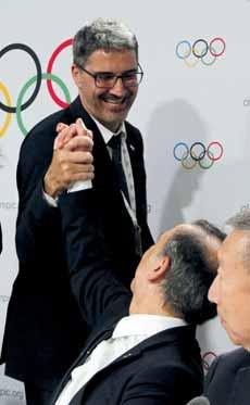 Südtirols Landeshauptmann Arno Kompatscher (stehend) freute sich 2019 in Lausanne mit dem Mailänder Bürgermeister Giuseppe Sala über den Zuschlag für die Austragung der Olympischen Spiele.