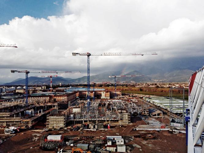 FOUR RAIMONDI TOPLESS TOWER CRANES AT WORK ON NEW HEALTHCARE FACILITY IN SOUTHERN ITALY