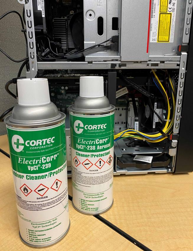 When it comes to deeper cleaning and protection of electronics, ElectriCorr™ VpCI®-238 and 239 are good tools to call up to the task. These two aerosols act like cleaning agents because of their moisture-displacing and penetrating film qualities. If sprayed on a surface and allowed to dry, they leave behind a thin film that inhibits corrosion. ElectriCorr™ VpCI®-238 is preferred for protection in indoor, enclosed environments, while ElectriCorr™ VpCI®-239 works better for outdoor, vented environments. Both should only be applied after equipment has been powered-off.