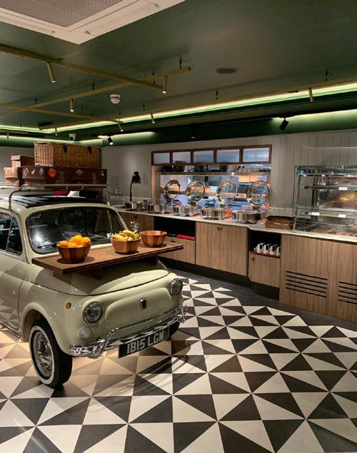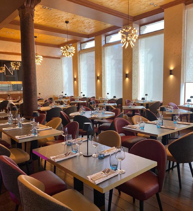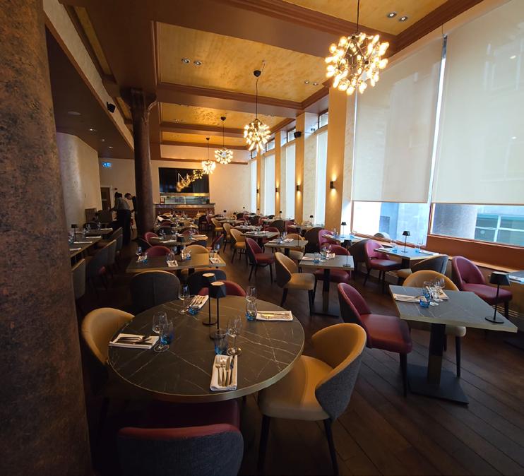 The 98-cover dining room has been given a glamorous update, with chandelier-style light fittings, marblestyle tables and faux-leather seating in deep reds and golds.