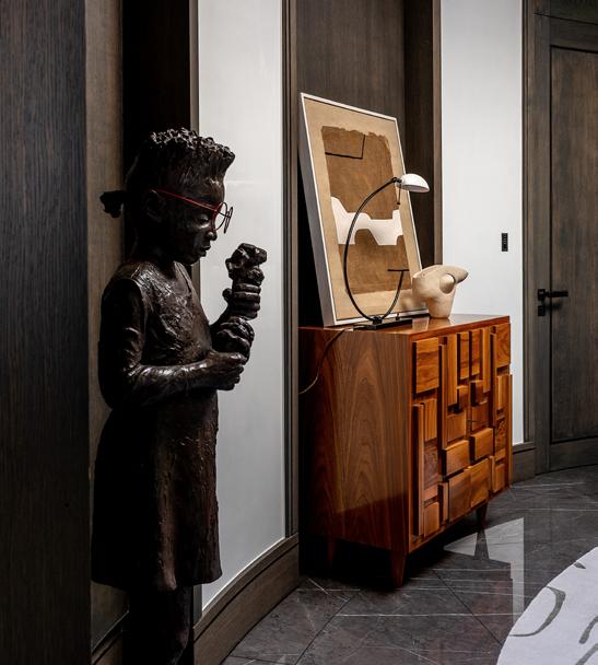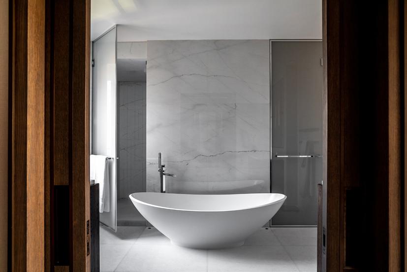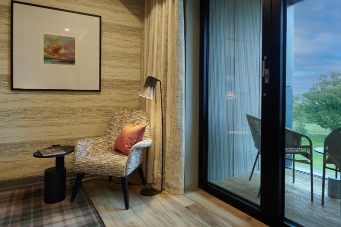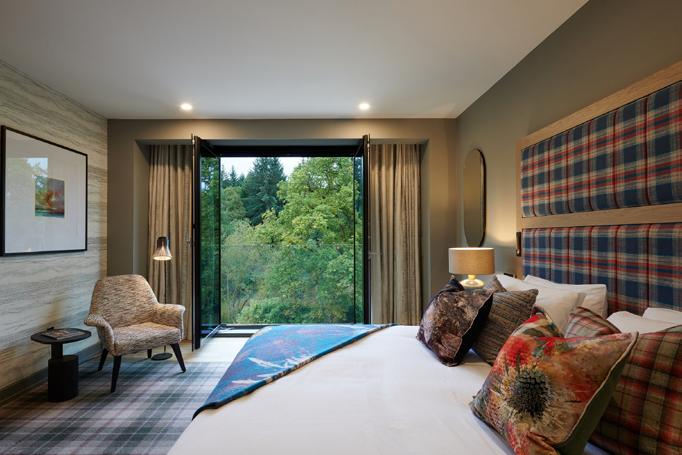 The newly built bedroom wing is open and light, featuring wall-to-wall bi-fold glazed doors with direct sight of the Loch. Bedrooms and suites use natural wood tones, beautifully handcrafted lighting, and soft Scottish fabrics layered with hued tartans and plaids, while spa-inspired bathrooms use a palette of natural wood and stone with timeless black accessories.